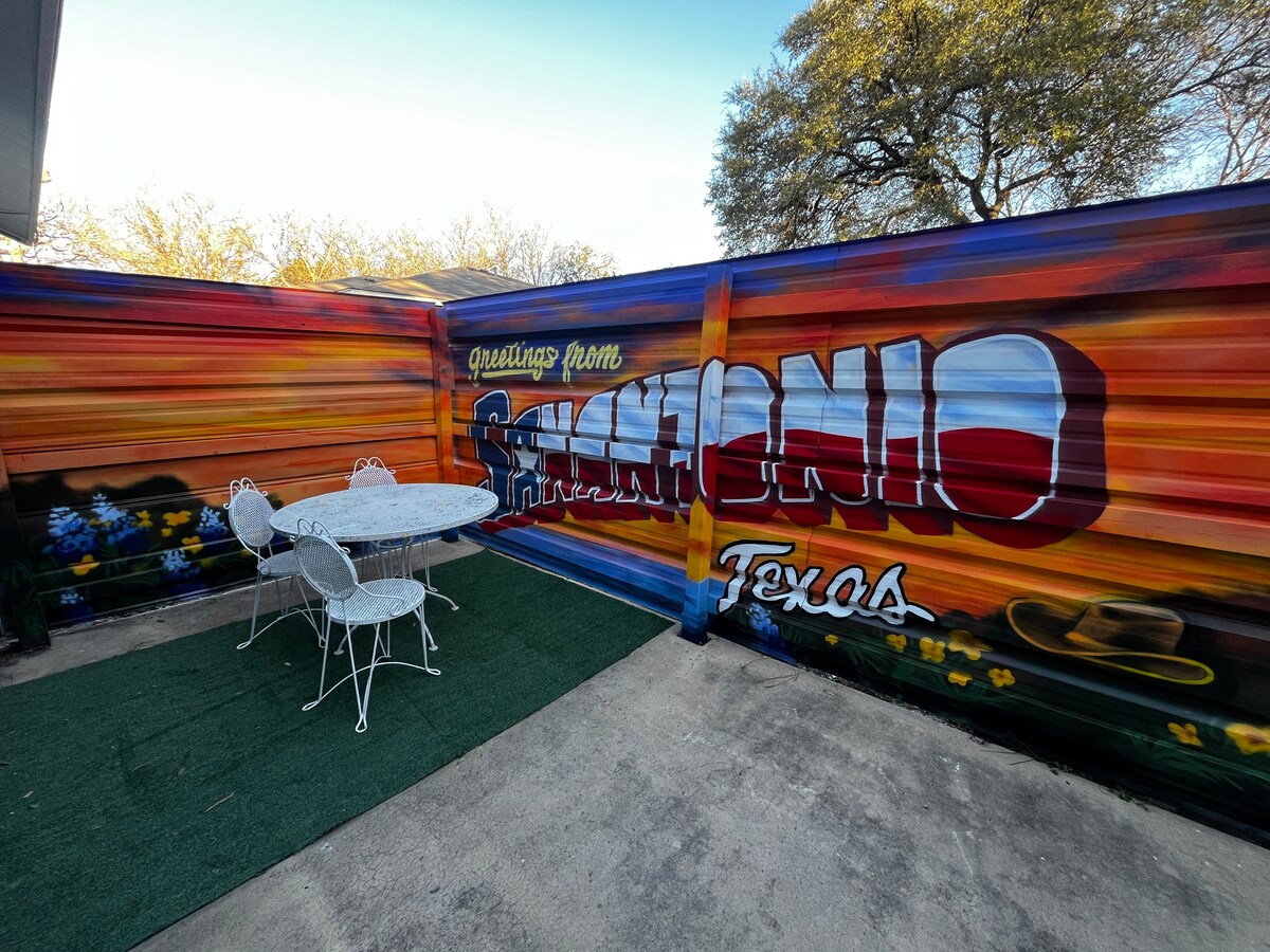 • Walk through a garden-like, fenced backyard and enjoy private keyless check-in. • Convenient access to The Pearl, RiverWalk, Medical Ctr, and Hill Country excursions. • Sleep late in your plush memory foam mattress, then enjoy your coffee on the patio or the fire pit. • Ideal for quality-minded guests, honeymooners, or anniversaries! • Small fridge + Keurig + Microwave + Fast Wi-FI. • • Superb A/C! Meticulous cleaning! • Enjoy our firepit ! Heart us a top right!