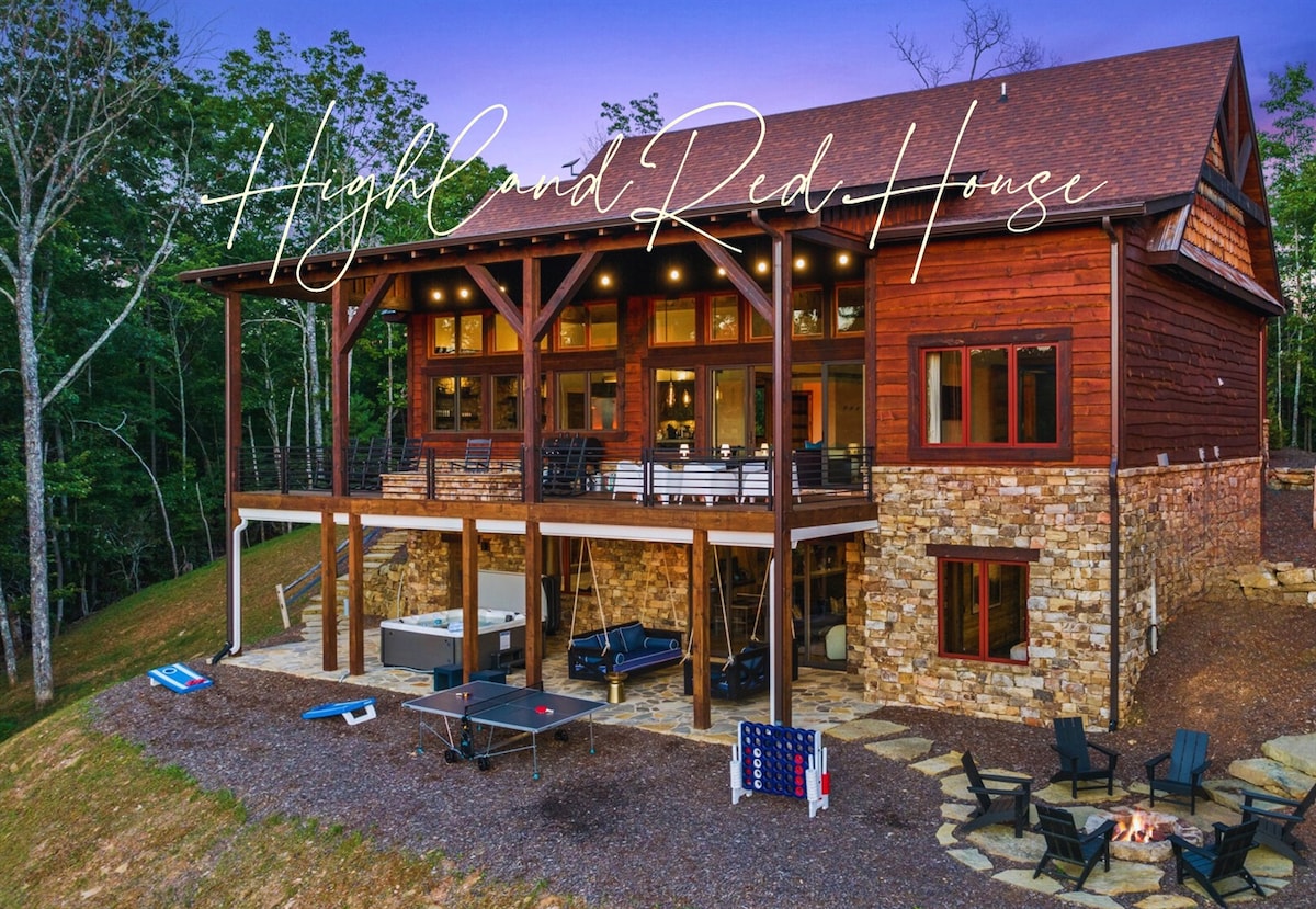 Escape to the serene charm of Lantern Landing, a brand-new cabin perched above Lake Blue Ridge. This 3-bedroom retreat blends luxury and comfort with en-suite bathrooms, sweeping lake views from a private deck, and inviting common areas. Unwind by the outdoor fire pit, soak in the hot tub, or explore the lake with complimentary kayaks. The patio features a large flat-screen TV and a game table with ping-pong and air hockey. Lantern Landing offers an unforgettable getaway for family and friends.