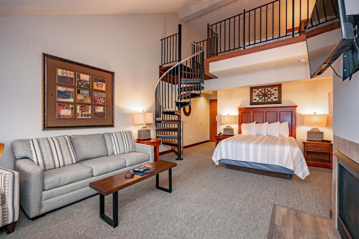 Third floor king and queen studio suite with loft, standard views and gas fireplace. (Elevator access included) Hotel amenities include an onsite marina (seasonal), onsite dining, game room, fitness room, sauna, free WIFI, and reading loft! Ask our front desk ahead of your arrival about adding on romance/massage packages or renting conference rooms for your business trip!