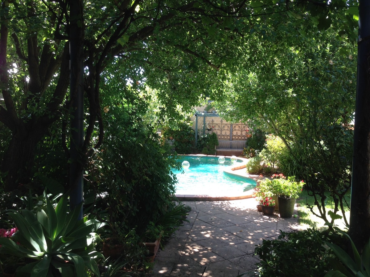 Our home is close to parks, cinema, restaurants and shops, and 20 minutes to the beach. You’ll love our home because of the outdoor space, the pool, the quiet neighbourhood, and close proximity to the city (3 minute walk to bus stop), the beach and the Adelaide Hills . Our studio is good for couples, solo adventurers, and business travellers. It is a self contained studio in a garden setting with private access and use of pool and gas BBQ plus continental style breakfast.