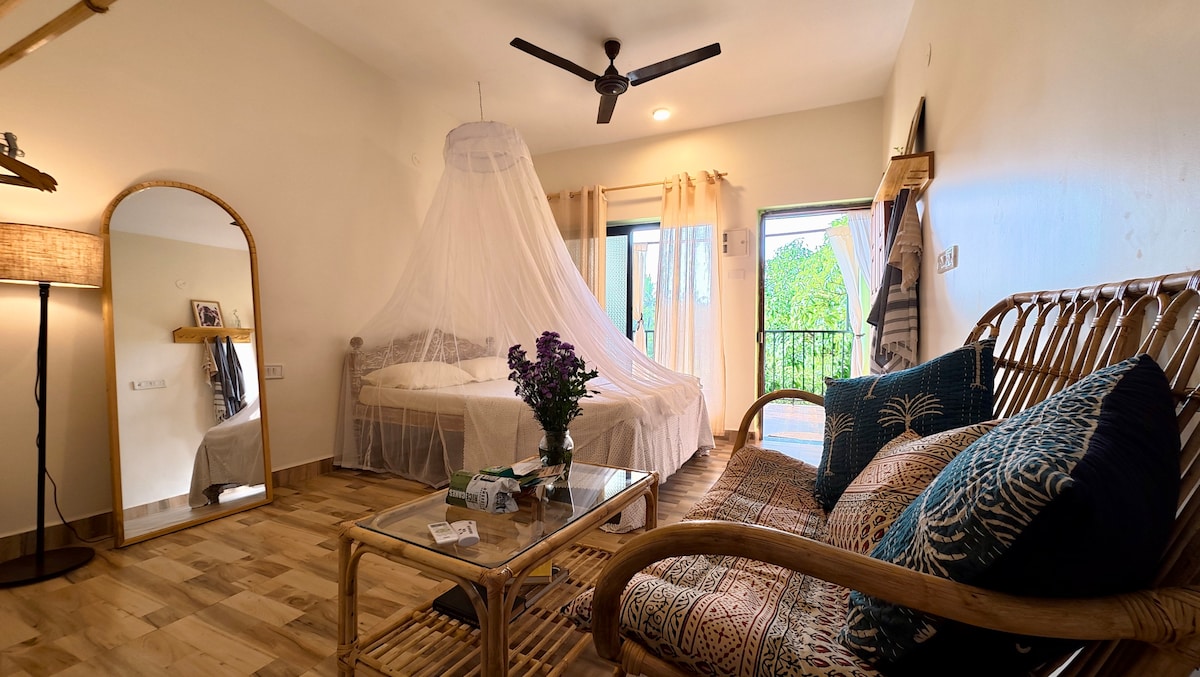 A beautiful boho vibe was front of my mind when creating this stunning cottage. Tucked away in a quite nook, overlooking an organic kitchen garden with the view of the fields, you will be trasported to a bygone era where things were just much slower. When spending time watching the birds & the bees, enjoying leisurely cups of tea, chatting on the balcony was part of the day. Surrounded by trees, you see another side of Goa. Yet you are literally 5 mins away from the party hub of Goa.