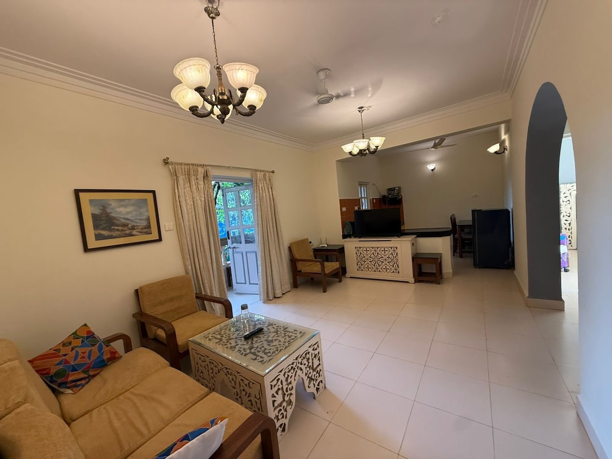 This unique place has a style all its own. With Hot water Bath tub for couple and kitchen with all cooking Utencils 100 mbps Lease Line Broadband Connection Unlimited. We have 5 caretakers for your 24 hrs service, Swimming 🏊 POOL, GYM, Clubhouse with TT table, 24 hrs inverter backup. Queen size 5*6.5 sq ft Bed in bedroom with quilt Close to baga calangute beach, 2 lifts, AC, Geyser, TV with tata sky,Towels, Fridge,queen size sofa cum bed in living room for 1 extra guest with pillows and quilts