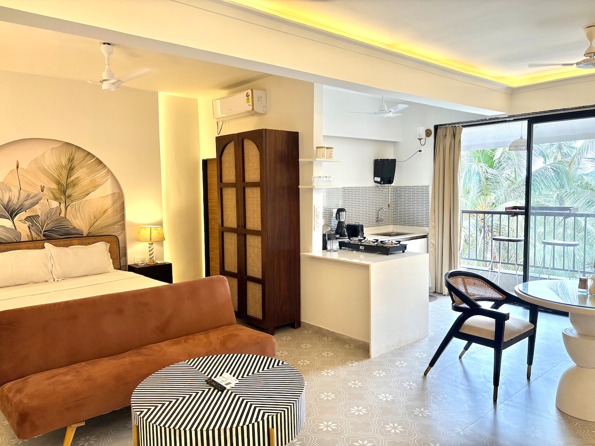 Step into the comfort of this luxurious 1 Bedroom 1 Bath apt with outstanding facilities in Calangute, Goa. It offers a tranquil retreat just 10min from the beach. Enjoy the breathtaking views of the lush green coconut fields from the cozy apt and its balconies. Modern design and a rich amenity list make it suitable for both remote workers and leisure travelers. ✔ King Bed ✔ Full Kitchen ✔ 3 Balconies ✔ Smart TV ✔ Ultra-Speed Wi-Fi ✔ Building Amenities (Pool, Gym, Rooftop) See more below!