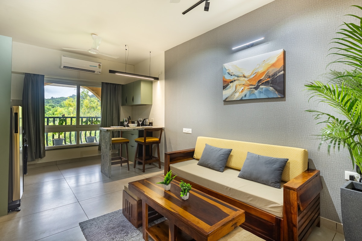 Cozy tropical themed studio in the heart of Vagator, just a short walk to the beach, Hilltop, Friday Night Market and top clubs like Romeo Lane & Mango tree restaurant. Styled with plants and earthy tones, it features a double bed, sofa & Smart TV, dining area, fully equipped kitchen and modern bathroom. Guests enjoy high-speed Wi-Fi, pool & gym access, parking for cars & bikes, 24/7 security & power backup. Perfect for couples, solo travelers or friends.