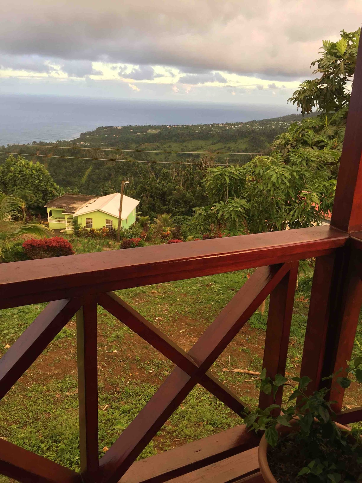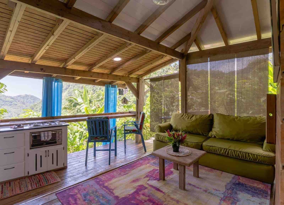 "FouFou Cottage" Seen as "10 Most Affordable Caribbean Destinations" & Safe in Nature CERTIFIED. Sustainably handcrafted, private, self-contained treehouse-style cottage with spacious verandah perfect for birdwatching & relaxing. A natural sanctuary with breathtaking seaviews & cool mountain breezes. A unique, 2 level Open Air, Eco-cottage with Modern Ensuite Bath & Kitchenette. Quiet & Conveniently located less than a mile to sites, restaurants, shops & beaches of Portsmouth.