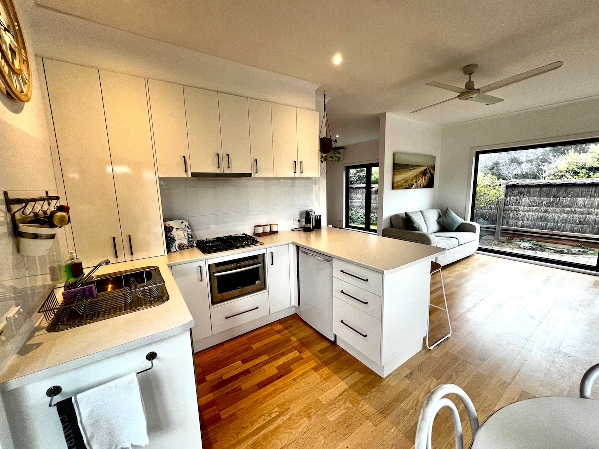 "Salty Rest". Fresh & clean. Seperate from our house; very private & quiet except for the birds & the ocean (300 mts). Virtually in the coastal park, a deck perfect for breakfast (cereal, bread, coffee, fruit, complimentary).A genuine hide-away. Drive time - 10 mins- Peninsula Hot Springs 5 mins- St Andrews Beach Brewery 5 mins- Beach horse rides 15 mins- 7 golf courses 15 mins- Red Hill wineries 15 mins- Sorrento 5 mins- vegan, pizza/fish, bottle-shop POOR PUBLIC TRANSPORT- Private arranged