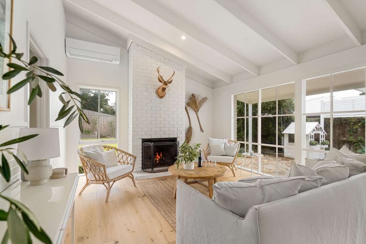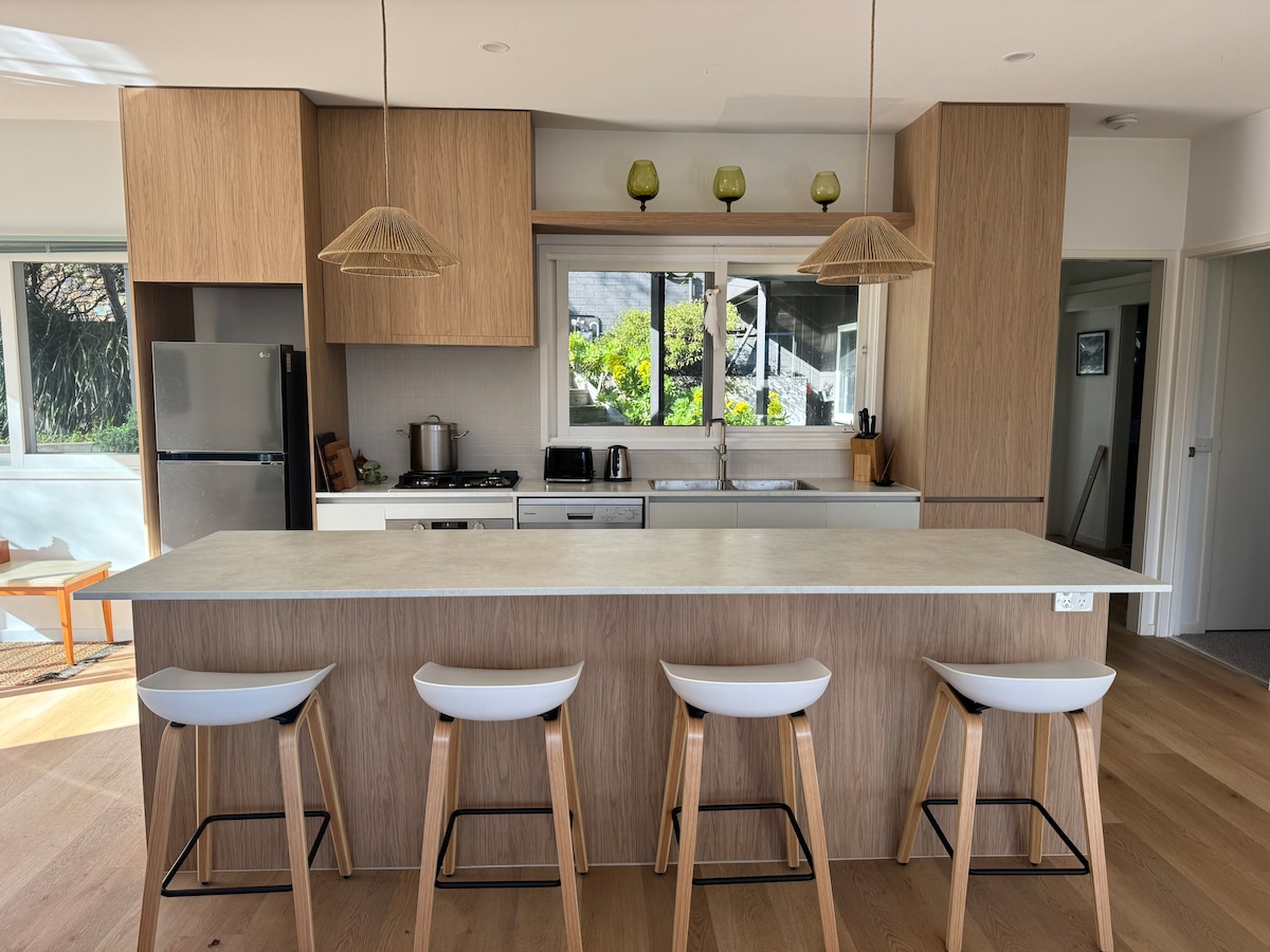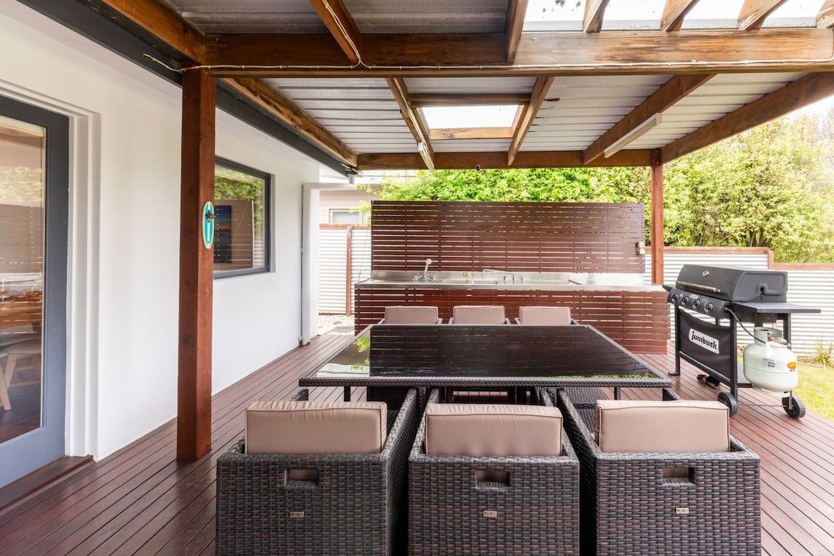 This renovated 4 bedroom home is only a 200 metre stroll through a nature reserve to Cowes beach, Red Rock beach and Ventnor. The expansive 10 metre deck under the wisteria vines enjoys a view to the sea from strategically positioned bar-stools, with an adjacent cosy outdoor dining area for 8 people. This coastal Hamptons boho escape has been stylishly decorated with brand new furnishings, a new farmhouse open plan kitchen & dining connected to the living room, and two very large bathrooms.