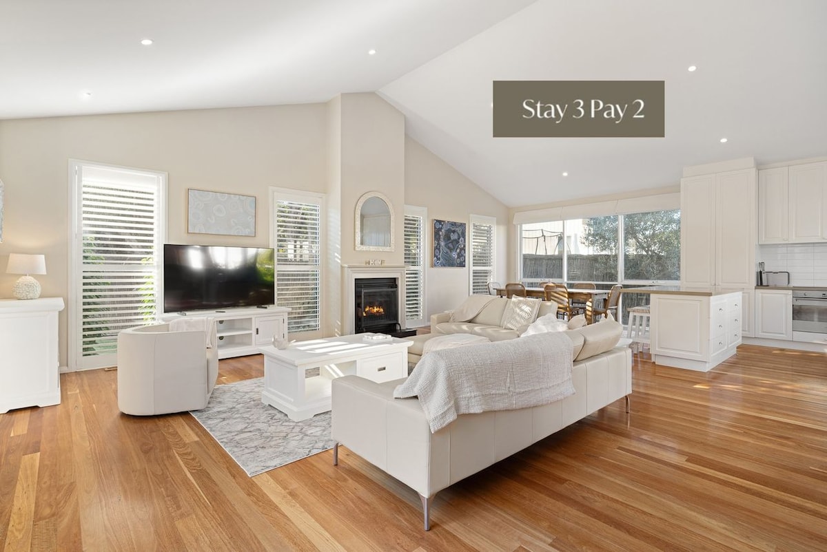 Just minutes from Rye’s back beach, this tranquil retreat sleeps six across three bedrooms. Relax in the private outdoor spa, unwind by the cosy wood burning stove, or enjoy year round comfort with split system heating and cooling. Set within a beautifully landscaped garden, it is the perfect base for groups visiting the Peninsula Hot Springs, exploring local wineries, golf courses, and the stunning Mornington Peninsula. Bath towels and linen provided. Vacuum cleaner, iron and ironing board.