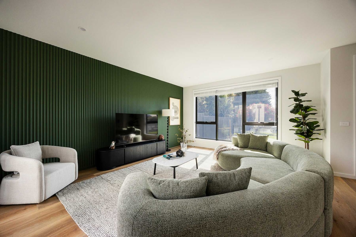时尚现代度假屋,漫步可至海滩与商店,距莫宁顿精华景点仅数分钟