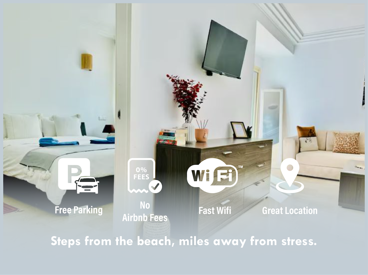 New apartment Beachfront with a spectacular Sea view and 2 balconies. A nice workspace with 100 Mbps WiFi Internet over fiber. Located in downtown, Medina, Souks, Restaurants and the Portuguese City are 15 min walk away. The city beach is a 20 min walk. PRM think about a taxi. Well equipped and carefully decorated for a cosy comfort and an unforgettable stay. Enjoy the sunrise, the scenic view, the clapotis or the calm. Cleanliness, Availability and Assistance are guaranteed. You’ll feel home.