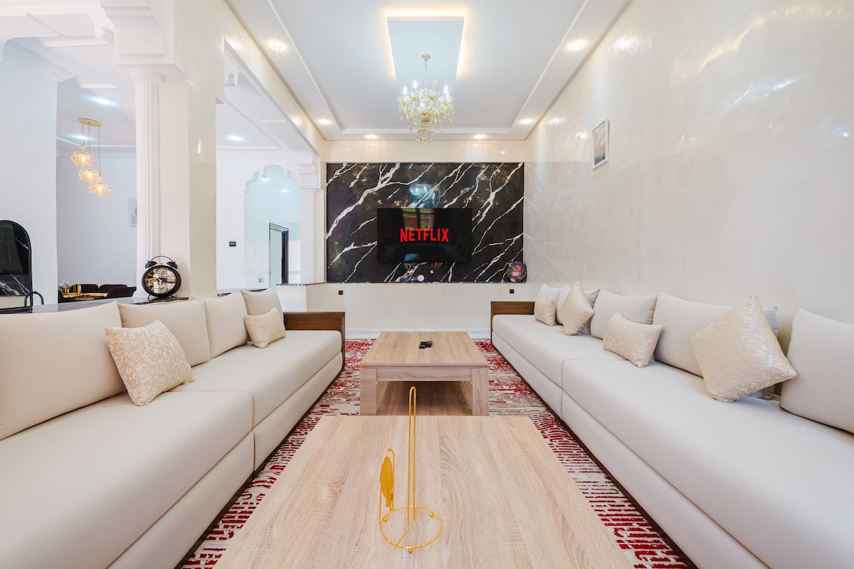 Luxueuse villa sans vis à vis, nichée en pleine nature à 20 min d'Essaouira, réputée pour sa piscine style plage chauffée de novembre à Avril. Ses couchers de soleil mémorables et son accessibilité aux personnes à mobilité réduite en font un lieu d'exception. Découvrez un espace luxueux, confortable et élégamment aménagé. Le salon lumineux offre un cadre parfait pour se détendre, avec une verrière automatisée pour une transition en douceur entre intérieur et extérieur.