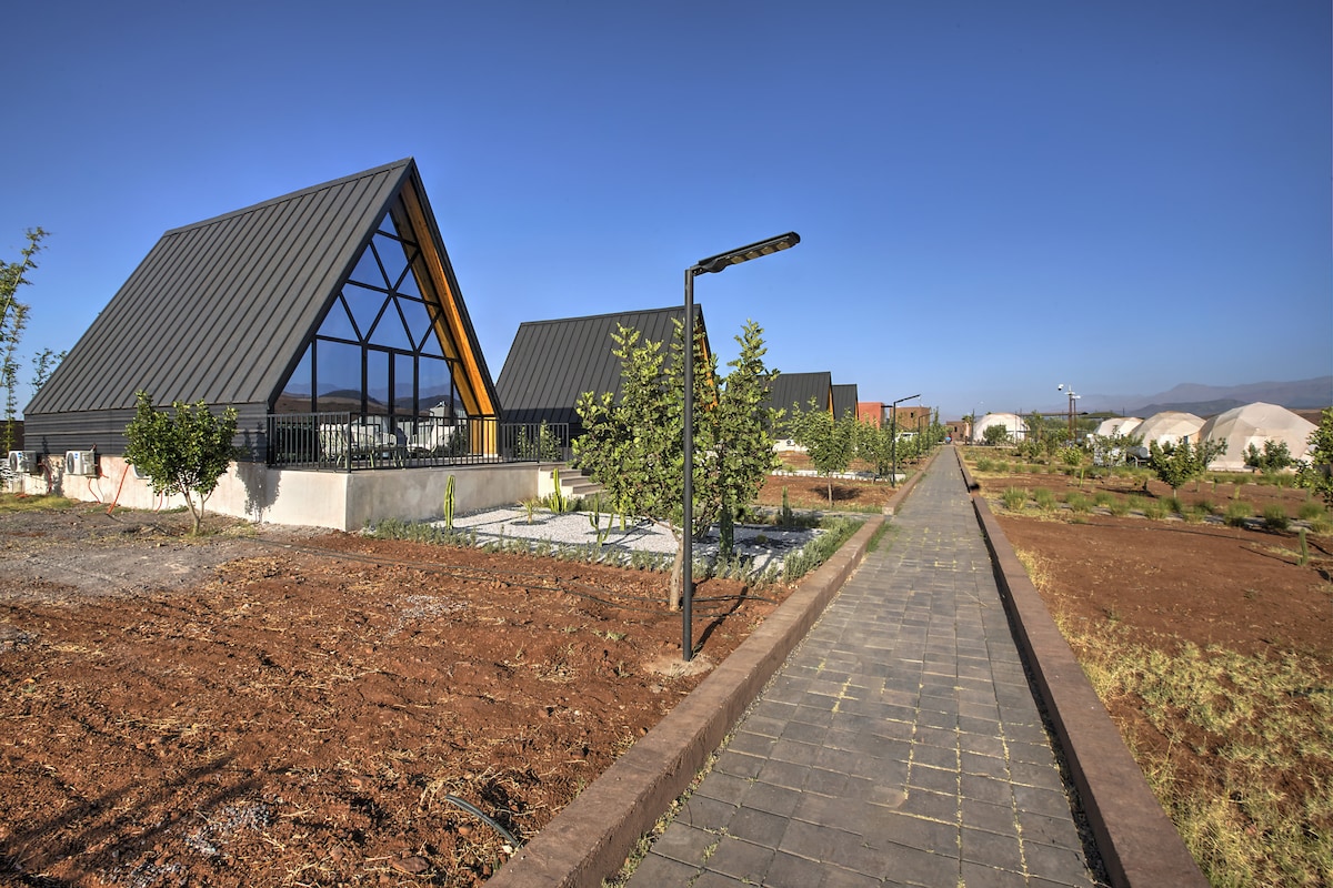Ideal for up to 5 guests, our A-frame chalet combines modern comfort and unique charm in the Marrakech region, ideally located between Marrakech and the Agafay desert. Enjoy your private pool for relaxing moments, plus access to the pools of The Ranch Resort, set within a 6-hectare mountain estate. A perfect getaway for families seeking nature, relaxation, and a memorable stay near Marrakech.