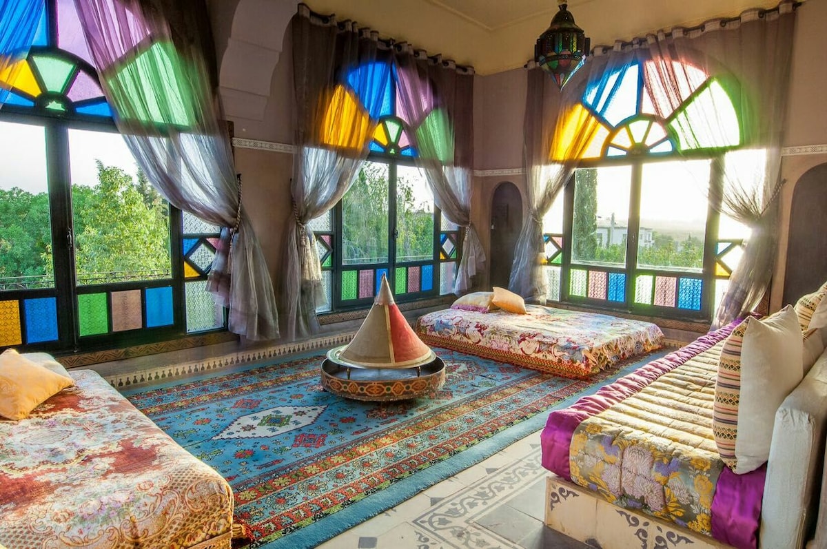 Masterfully blends timeless Moroccan style with modern design Located in the heart of the old Fez Medina. Offers an unparalleled experience. The expansive suite features a large bedroom, living room adorned with Moroccan mosaic private bathroom and air conditioning. Hand-picked furniture and exquisite fabrics create an atmosphere of elegance. Start your day with a delightful breakfast on your private terrace and enjoy ultimate peace and privacy. Experience the magic of Morocco like never before!