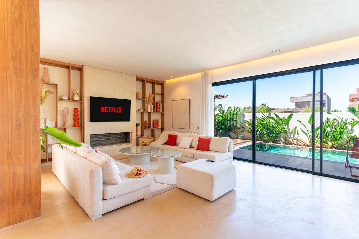 Villa située à 30 minutes de Gueliz dans un charmant domaine sécurisé 24/7 avec terrain de tennis commun et piscine privée. La villa se compose de 3 tres grandes suites avec chacune leur cheminée, leur télé (Netflix gratuit), 3 salles de bain, d'une petite piscine intérieure chauffée, d'une piscine extérieure privative et d'un jardin privatif sans vis à vis, d'un salon avec cheminée. Table à manger convertible en billard et en table de ping-pong. Idéal pour se détendre au calme.