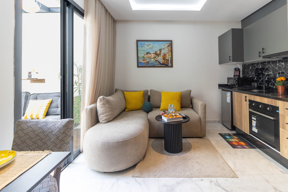 Profitez de votre séjour dans un appartement moderne et bien meublé à côté de toutes les commodités d'une nouvelle résidence. Il dispose d'une chambre équipée d'un home cinéma 4K, d'un salon, d'une salle de bain, d'une cuisine américaine et d'une petite terrasse. • Climatiseur performant • Accès rapide à Carré Eden, Majorelle, restos • Home cinéma immersif En plus, une connexion Internet 5G est incluse pendant votre séjour. Marrakech vous accueillera toujours. 😊