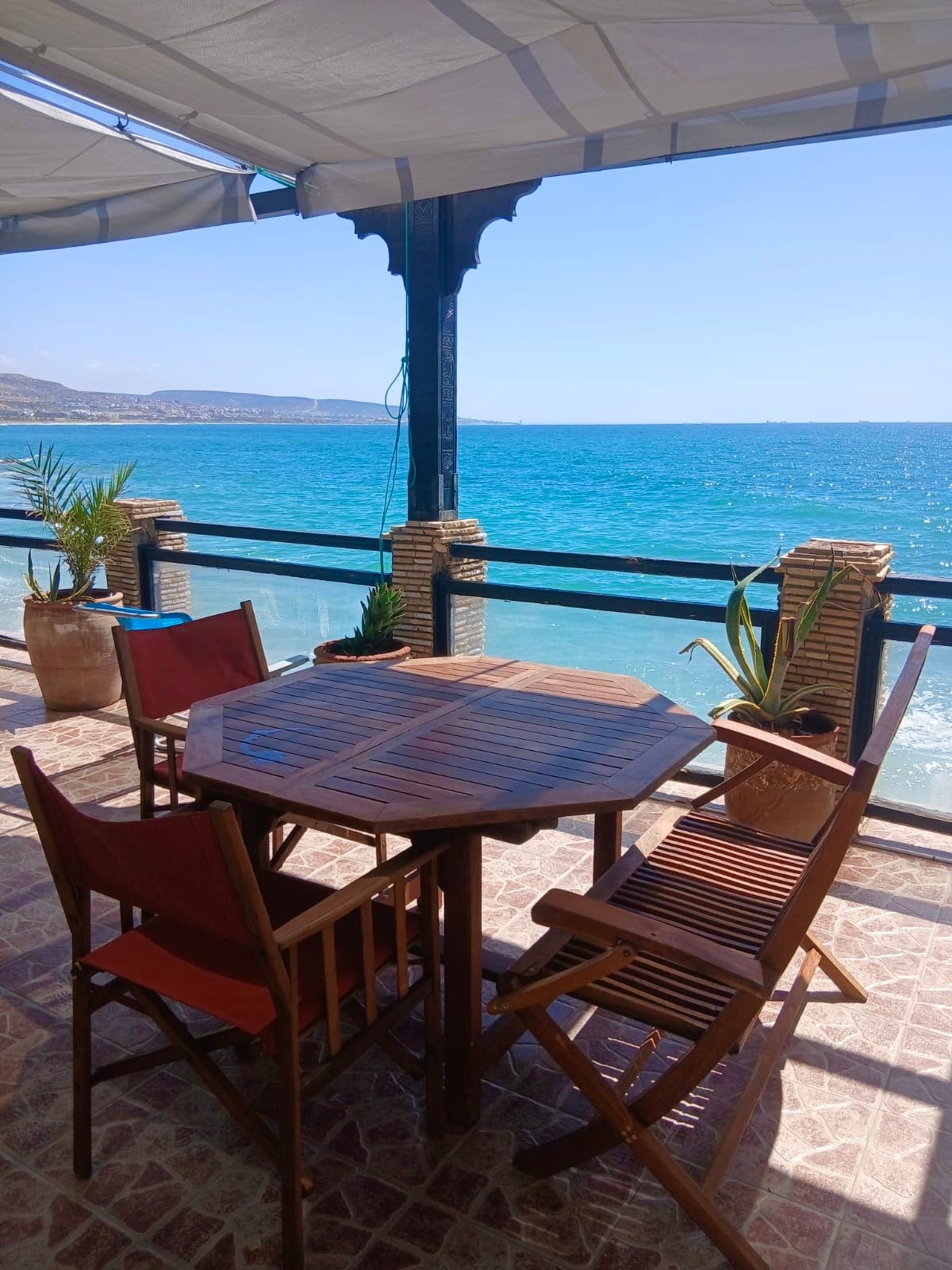 Nestled in vibrant Colorful Aghroud village, Rosyplage is a beachfront gem offering stunning ocean views from every room. Ground :fully-equipped studio 1st floor feels like being on a boat with a Moroccan lounge & 75-inch Netflix-ready TV.Two sea-facing bedrooms await upstairs.Top-level: kitchen leading to a terrace, followed by a sun-soaked solarium ideal for yoga & sunsets.Note: The accommodation is equipped with a surveillance camera at the entrance.the house has 4 levels stairs not suitable