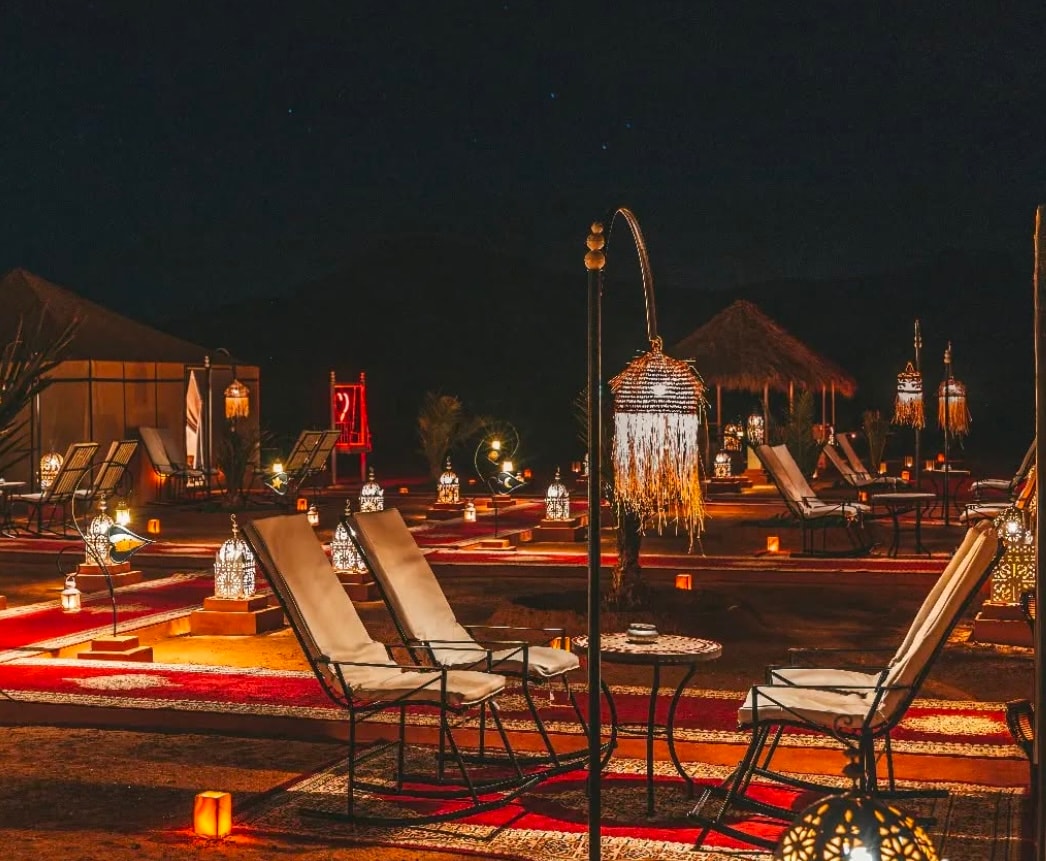 Nous vous accueillons chaleureusement dans notre famille et notre maison, pour partager avec vous la beauté et la magnificence du Sahara et vous imprégner du rythme de la vie nomade. Une expérience unique au Sahara mérite un hébergement unique. Indigo Luxury Camp est un petit camp privé offrant authenticité et confort dans les dunes de sable de Merzouga. Ce camp de luxe est détenu et géré par des autochtones du Sahara.