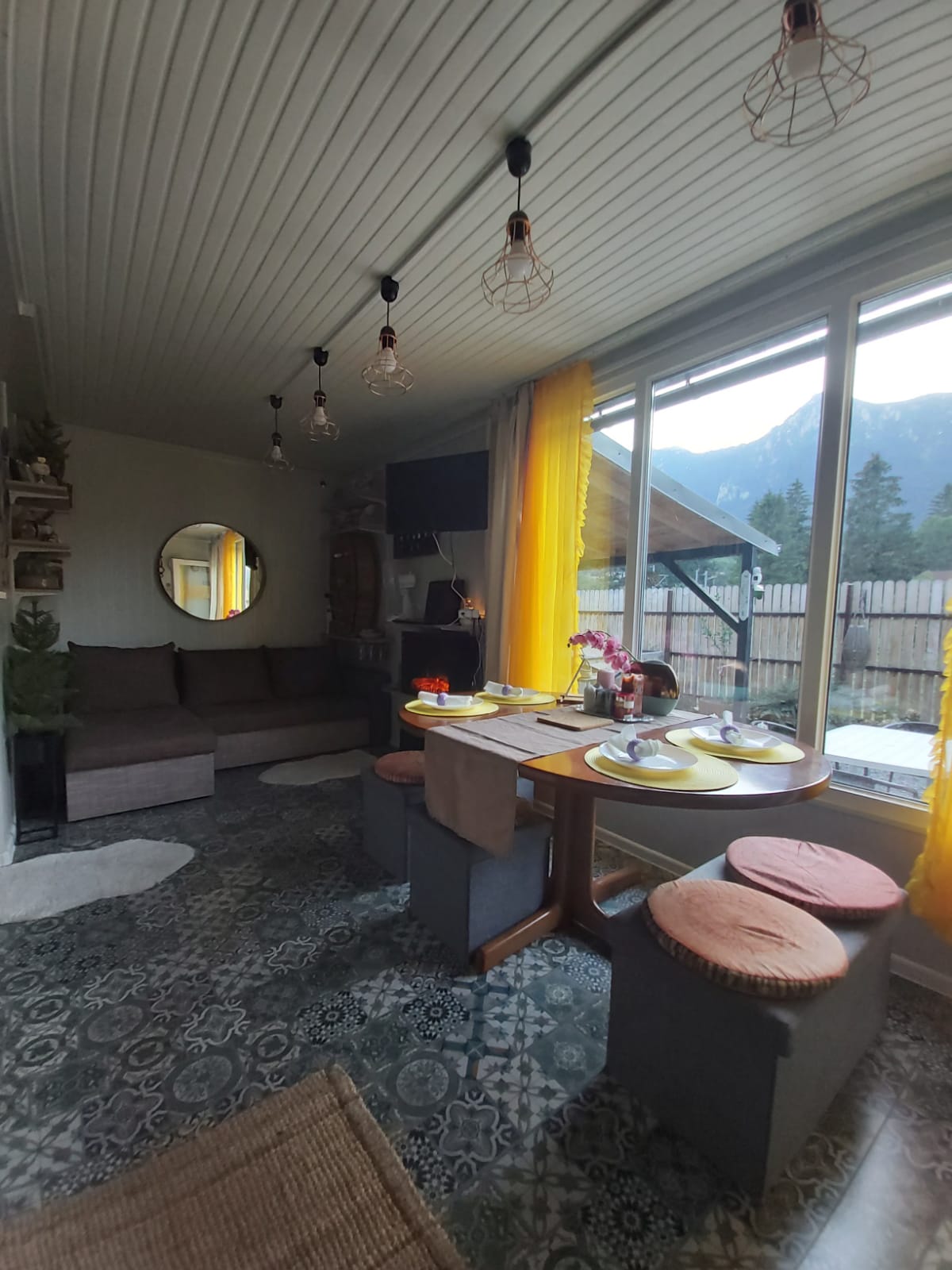 Ground floor of a holiday home, in Busteni, Zamora, superb view of the Bucegi ridge. 20 sqm yard, swing, barbecue. Free parking at the property. Interior with kitchen - oven, hob, microwave, coffee / tea maker, kettle, dishwasher, fridge + freezer; 2 bedrooms with double bed; living room with TV (over 100 channels), sofa bed, good wifi, bathroom with shower + a second toilet. In the courtyard, with separate entrance, yard and no common spaces, there is another building, with 2 studios.
