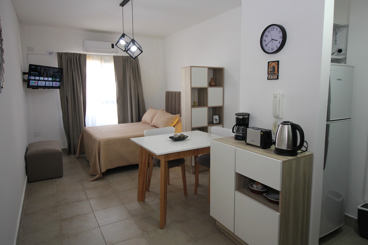 Relajate en este espacio tan tranquilo y elegante. Ubicado en una zona estratégica de Castelar a metros de la plaza del vagón y el centro, a dos cuadras de la estación. Calefacción con radiadores, aire acondicionado, smart tv y pisos de porchelanato con techo hormigón a la vista .