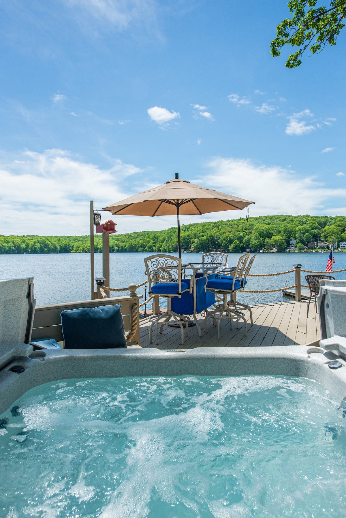Lake front Estate with great views, stone walls, a stream & backwoods forest. The house has a brand new entertainment deck with a gazebo, grill & outdoor kitchen, a 12 x 18ft swimming pool and an enclosed gazebo with a HotTub for 7 . By the lake a 2nd deck with lounge chairs, umbrellas a 2nd grill, picnic area as well as a boat dock! Lake swimming area , adult and kids kayaks and life jackets! At the end of a small road, which makes it a secluded Paradise only 50 miles from NYC!
