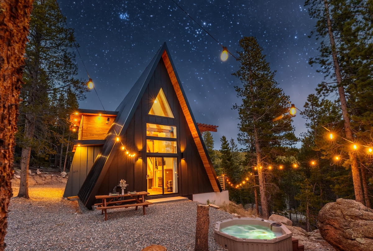 RED ROCKS LUXE RETREAT | HOT TUB • DESIGNER TOUCHES Perched at 9,000 feet, this private mountain hideaway seamlessly blends modern luxury with the serenity of nature. Soak in the hot tub with panoramic views, unwind by the fireplace, or cook in the chef’s kitchen. Surrounded by towering pines, 30 minutes to Red Rocks, nearby hiking & mountain biking trails, and ski spots. Whether it's romance or relaxation, this designer retreat delivers the perfect Colorado escape.