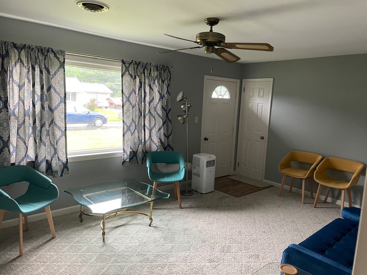 With an excellent location on Broad St. in Hamilton Village, the space is just a block walk to campus or downtown. There is a private entrance to the ensuite on the 1st floor (keyless entry code). It has a private bath (shower), king bed, smart TV with basic cable, Keurig, mini fridge, sitting area, and WiFi. A mini-split provides heat and air conditioning. Also, a fireplace w/remote control. A twin rollaway is available upon request. This suite is perfect for campus visitors.