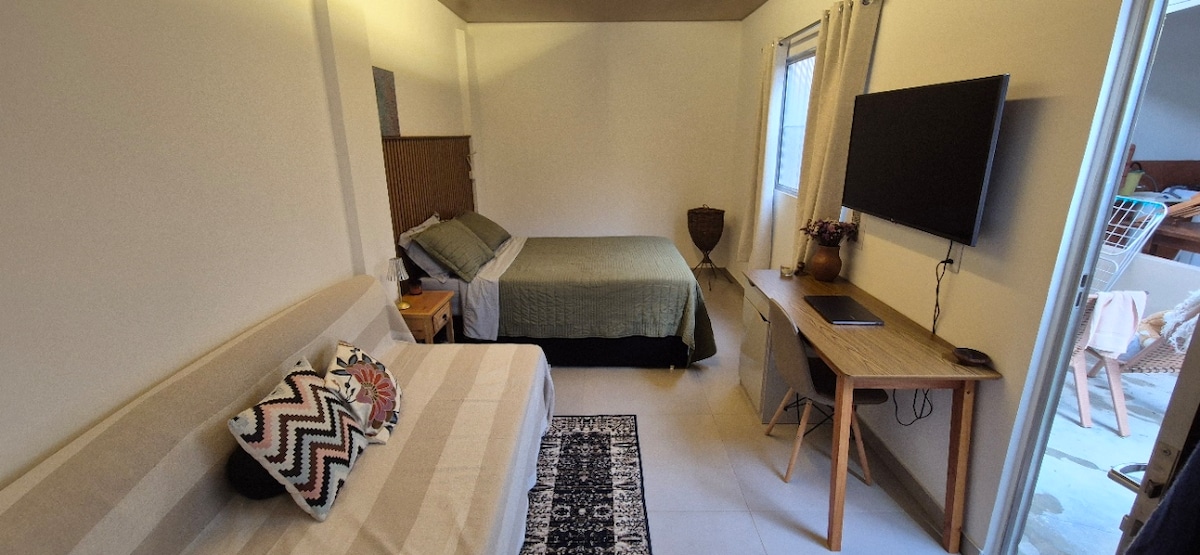 Quarto e sala aconchegante e completo, ideal para uma ou duas pessoas. O espaço é confortável, bem organizado e perfeito para uma estadia tranquila. A cozinha possui os itens básicos para preparar suas refeições com praticidade. Localizado em um pequeno e tranquilo residencial, a cerca de 1,5 km do centro, oferecendo fácil acesso à cidade e um ambiente calmo para descansar.