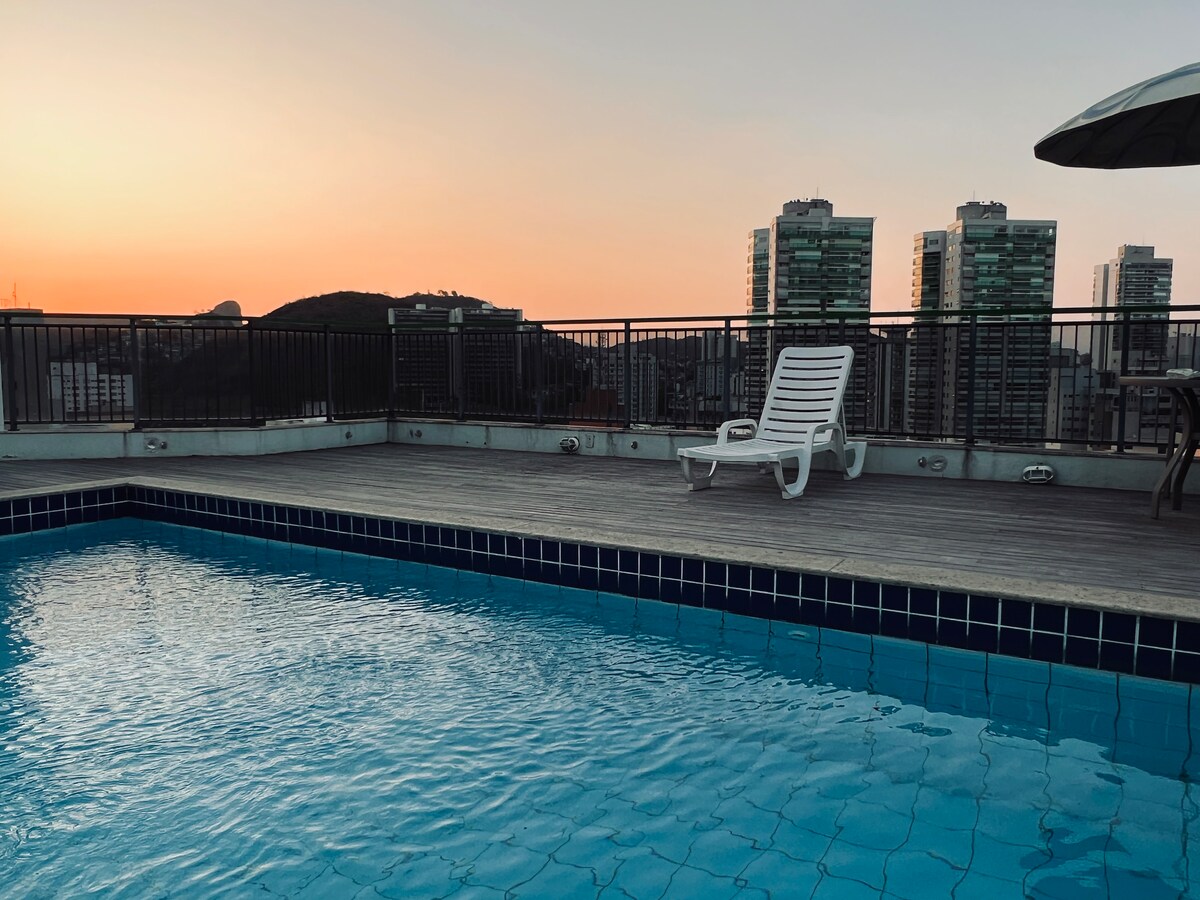 Cobertura com Jacuzzi e vista para o mar com teto solar. Muito espaçosa (65 m2). Melhor ponto da Praia da Costa, a melhor praia de Vila Velha! Cozinha totalmente equipada com utensílios diversos para bar, coqueleteria e taças finas. Suíte climatizada, confortável e aconchegante. Simplesmente a melhor experiência de hospedagem de Vila Velha! Sua estadia por aqui será perfeita! SÓ VEM !!!