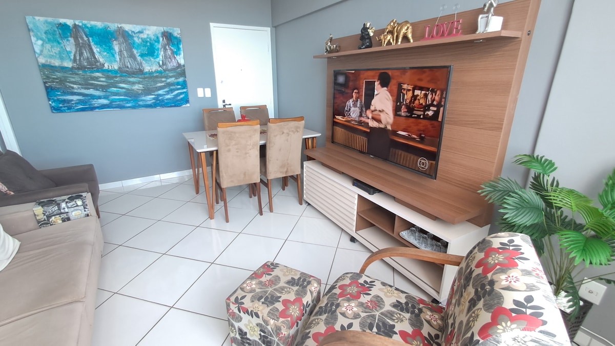 Apartamento aconchegante de 60 m2, com 1 Q, 1 WC, Sala/Cozinha e Varanda com ótima vista, 5º andar, ótima localização para turismo ou negócios. Próximo a ótimas praias, ciclovia na orla, shopping center e área de negócios. Conta com roupas de cama, banho, utensílios de cozinha, talheres, fogão/forno, microondas, sanduicheira, liquidificador, produtos de limpeza e higienização... O prédio dispõe garagem coberta e área de lazer na cobertura com academia, sauna e piscina.