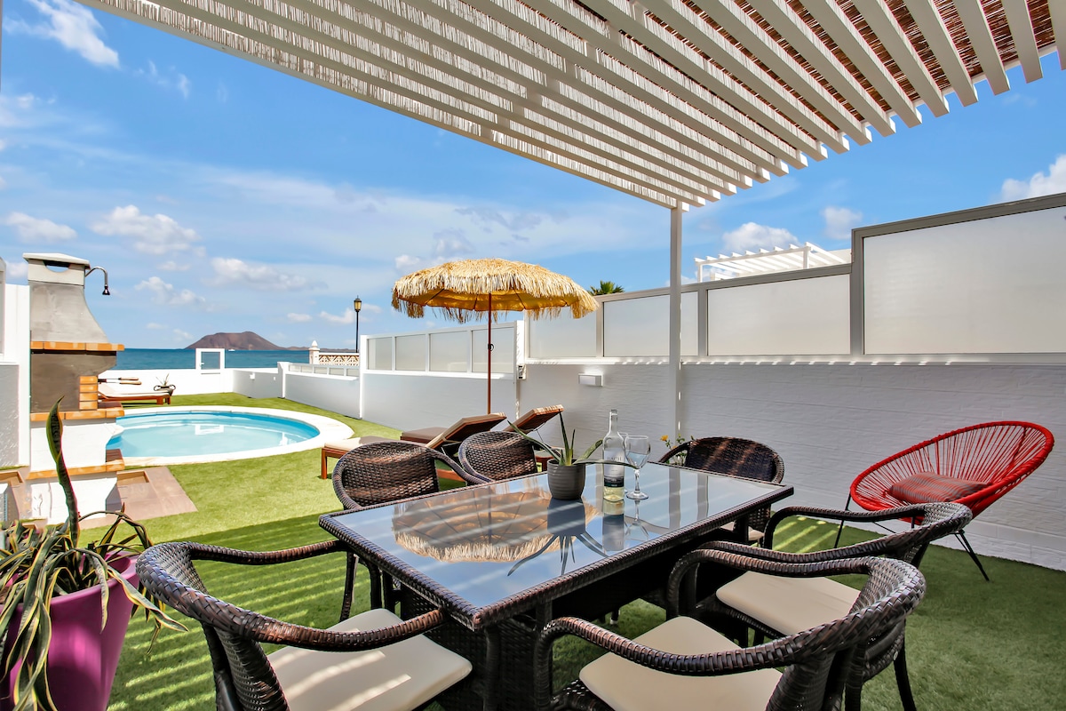 Nice independent villa in Playa Blanca. At the foot of the Montaña Roja volcano, quiet and facing south. Tropical garden on black volcanic scoria and swimming pool heated to 28°C. Outdoor shower. 2 covered terraces with garden furniture, deckchairs, Balinese bed and covered outdoor dining area. Private parking. Entrance, large living room, well-equipped kitchen, 1 en-suite bedroom with marble bathroom and dressing, 1 double bedroom with dressing and marble bathroom 50Mbps WiFi, Smart TV 55th.