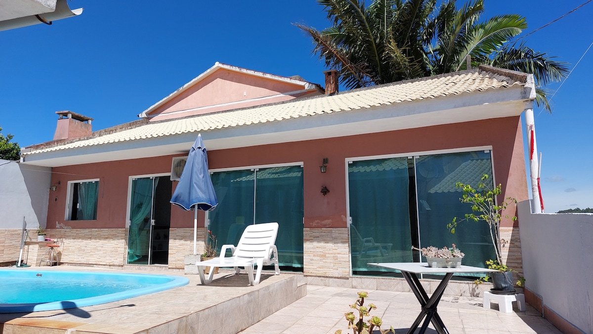 Casa com pátio fechado, piscina com aquecimento solar, lareira e espaço gourmet com churrasqueira e banheiro . Dois quartos: um com cama de casal e outro com cama de casal e beliche. Na sala um sofá-cama, mais colchões. Total de 2 banheiros,um na casa e outro na área gourmet. E pros dias frios de inverno a casa conta com lareira,onde deixo lenha disponível, o primeiro fogo é por conta da casa.A lareira fica na sala principal da casa .