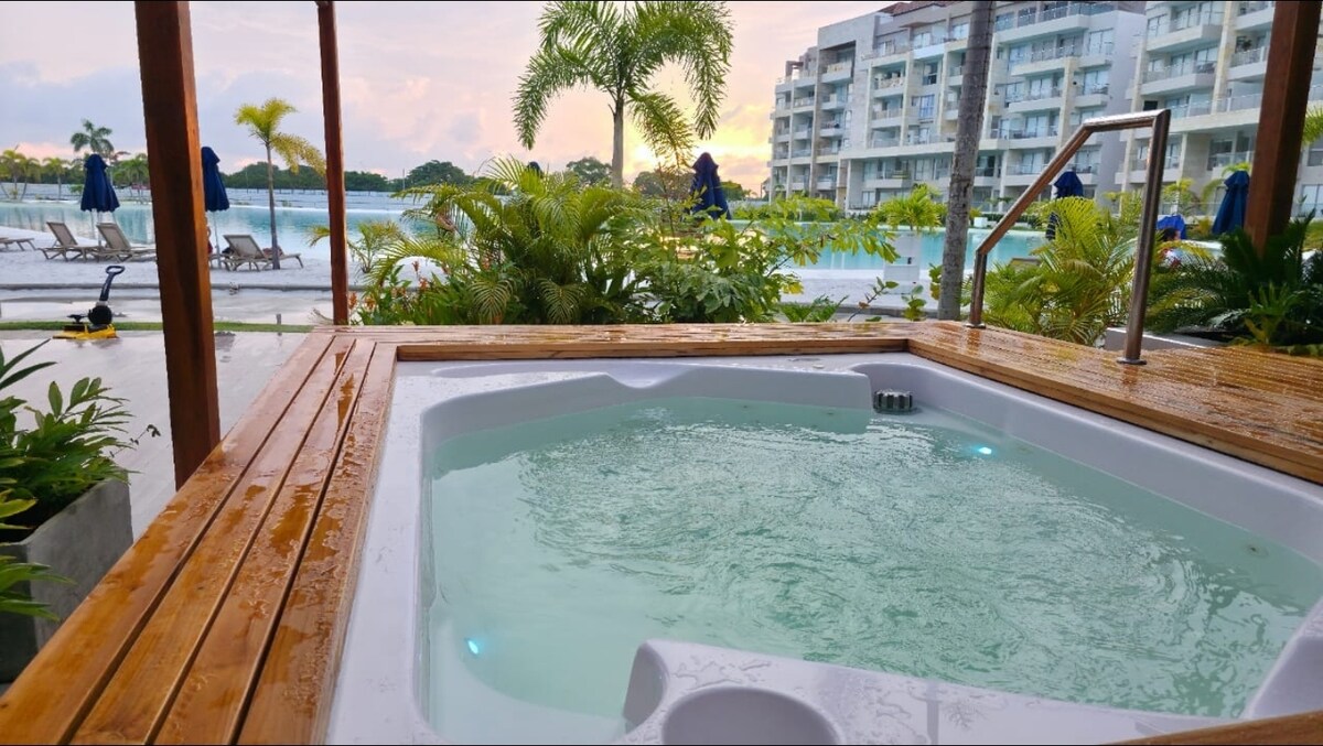 Un enorme apartamento de 120 m2 con una ubicacion envidiable lejos de la bulla, el jacuzzi y su vista al mar son impresionantes! Un apartamento increible, todas las habitaciones y sala con aire acondicionadoy acomodaciones 5 estrellas - area 120 m2 - jacuzzi privado en balcon - bacon grande con vista al mar - acceso directo a la playa - piscina sin fin en el ultimo piso - 10 min de distancia a la ciudad amurallada - wifi - 2 televisiores - INCLUYE EMPLEADA DE ASEO DIARIO SI LO DESEA