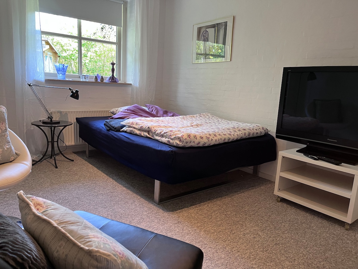 Bo i gå afstand til skov og strand, og med haven lige ned til en skolesø med store grønne arealer. Gård med spisemøbler og pejs. I skal bo i kælder etagen som i får helt for jer selv, med 2,05 meter til loftet. Stort værelse med spisebord og dobbelt seng. Lille værelse med 120 cm bred seng. Stort nyt badeværelse med brus. Tekøkken med køleskab og miniovn. 200 meter til bager. 1,7 km til gågaden. 3,6 km til Jesperhus feriepark. 300 m til et Fitness center, Padelhal og legeplads.