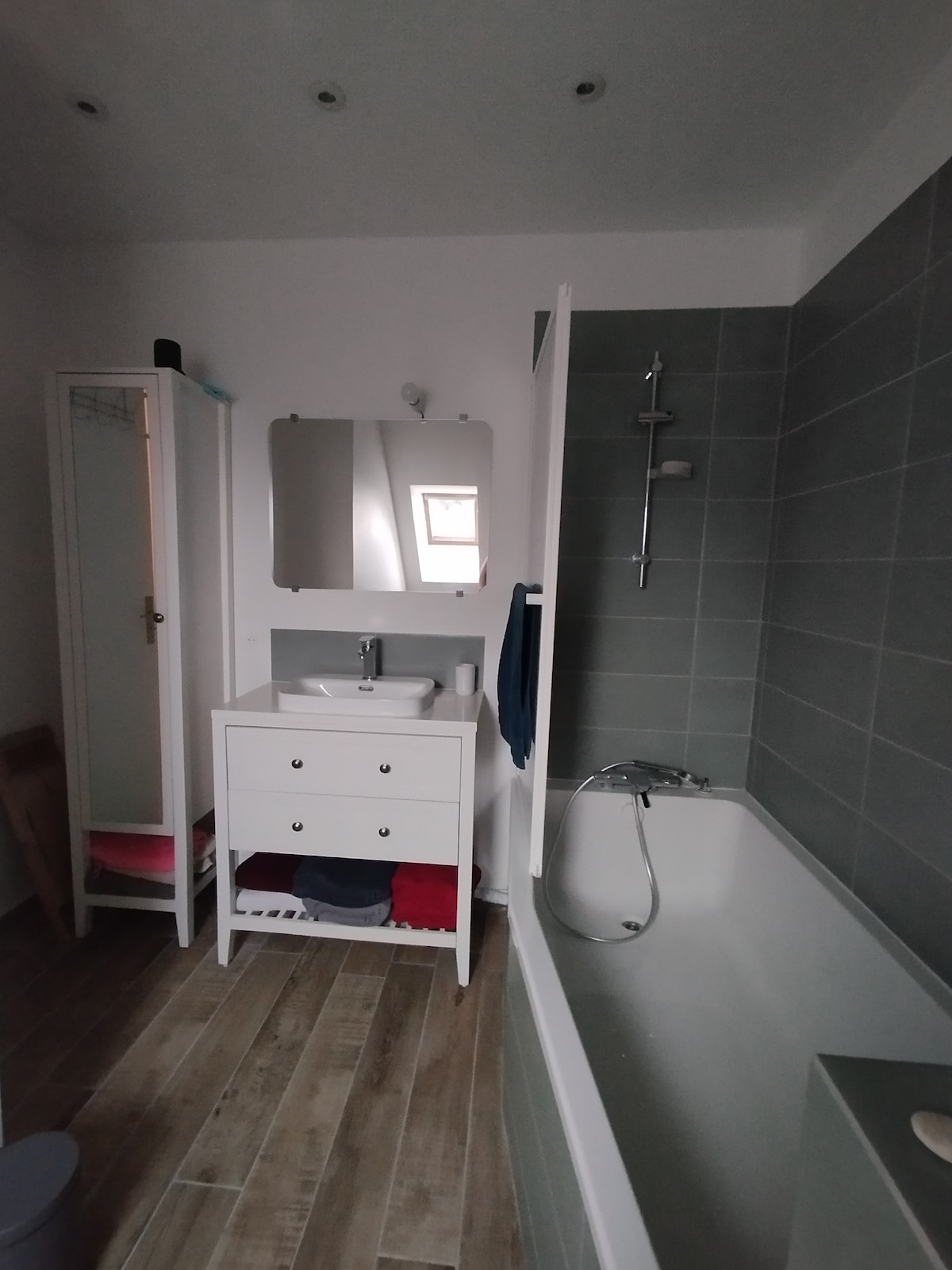 Endroit agréable pour les amoureux de la nature et de la simplicité. La maisonnette se situe dans notre jardin et pour y accéder, il faut emprunter le chemin de dalles. Composée de deux pièces, dans la première se trouve le séjour équipé d'un espace cuisine avec table à manger et 2 chaises, ainsi qu'un coin canapé et télévision. Puis, dans la seconde, il y a la chambre emménagée d'un lit 2 places, d'une penderie et d'un bureau, avec une salle de douche juste à côté. (Logement non fumeur)