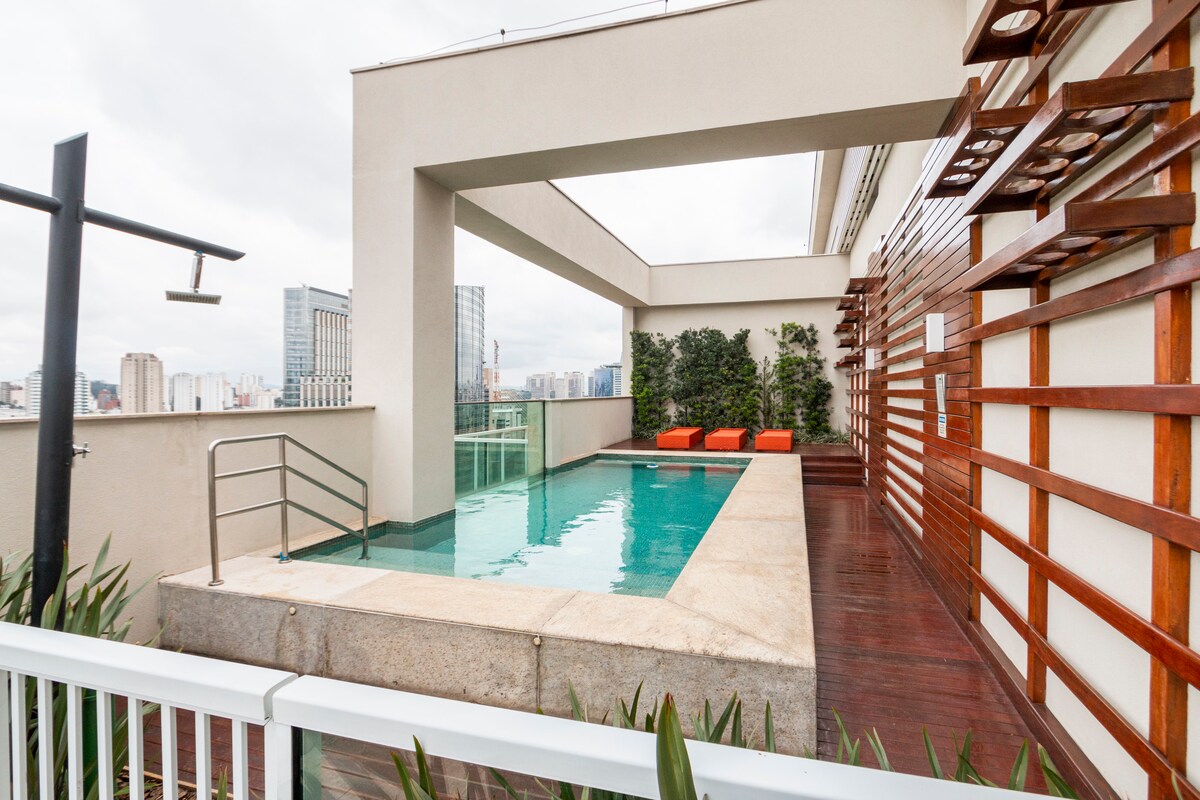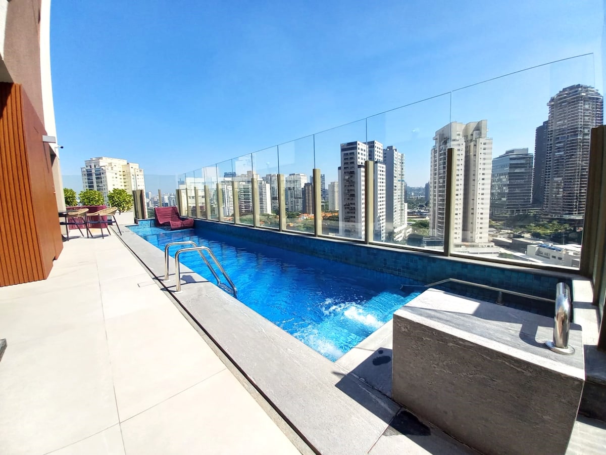 Desfrute SP com qualidade, conforto e conveniência. Studio contemporâneo com garagem, perfeito para até 4 pessoas, localizado em uma das melhores regiões da cidade, a passos dos Shoppings Morumbi e Market Place, Consulado Americano, Av. Berrini, Rochavera, WTC, Estação Morumbi da CPTM e a 5km do Aeroporto Congonhas e Hospital Einstein. O prédio tem academia, piscina térmica, solarium, salas de reunião e na cobertura maravilhoso sky view, com bar e piscina. Viva SP com excelência!