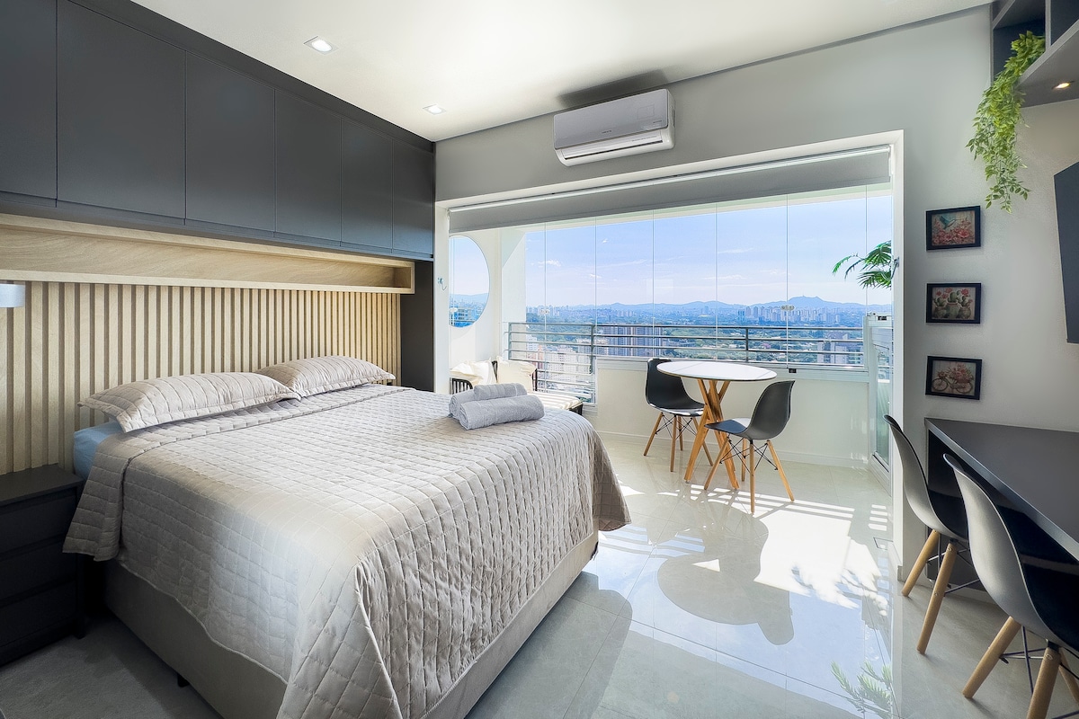 Studio em local tranquilo, bem-localizado e com vista deslumbrante! Equipado com cama casal, sofá-cama, ar-condicionado, wifi 200GB, armários, geladeira, cooktop e SMART TV (streamings). Colado no Shopping Cidade Jardim! A 8 minutos do Hospital Albert Einstein A 9 minutos do Estádio do Morumbi A 2o minutos do Autódromo de Interlagos Próximo aos bairros Itaim, Vila Olímpia e do Aeroporto de Congonhas. Condomínio com lavanderia, mercado, piscina e academia. Vaga de garagem. Portaria 24h.