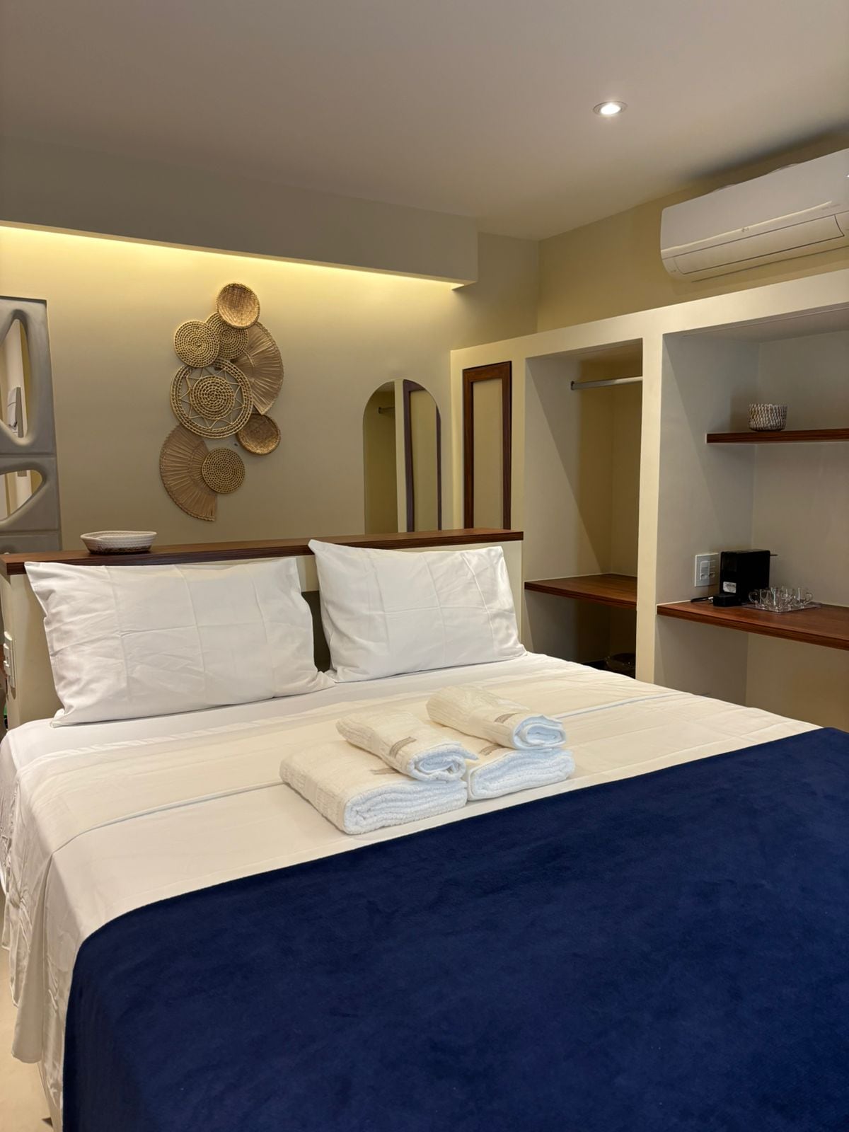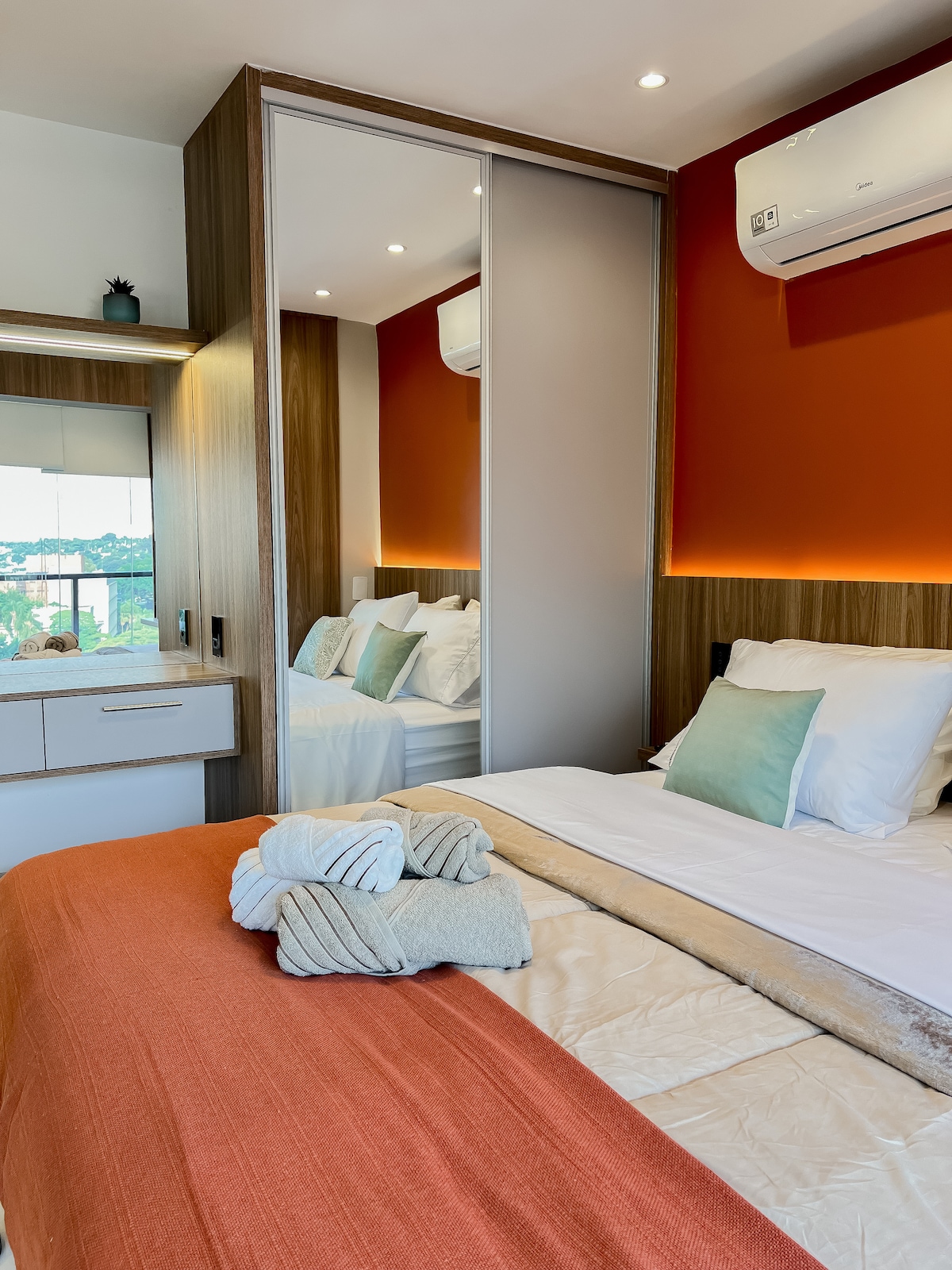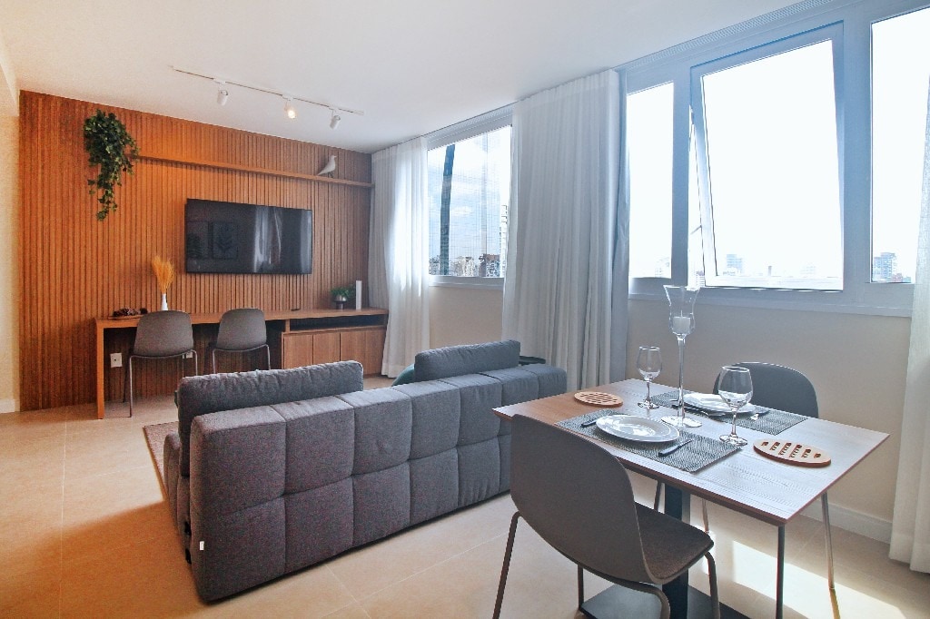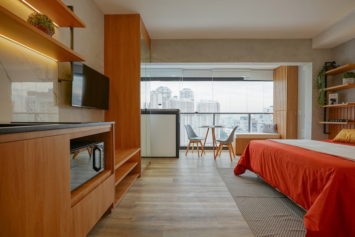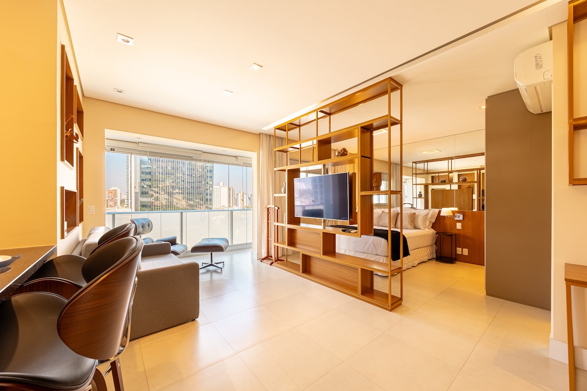 Experience One Eleven in Vila Olimpia. This modern apartment features large windows with breathtaking city views and natural light. The unit boasts 600 Mbps internet and a 4K HD TV. For total comfort, it has a Hot/Cold AC system: 27,000 BTU/h unit in the living room and 10,000 BTU/h in the bedroom. The bedroom is quiet and dark for a restful sleep. Impeccably maintained, you’ll be walking distance to top restaurants and business hubs—a safe, upscale retreat with a stunning urban backdrop.