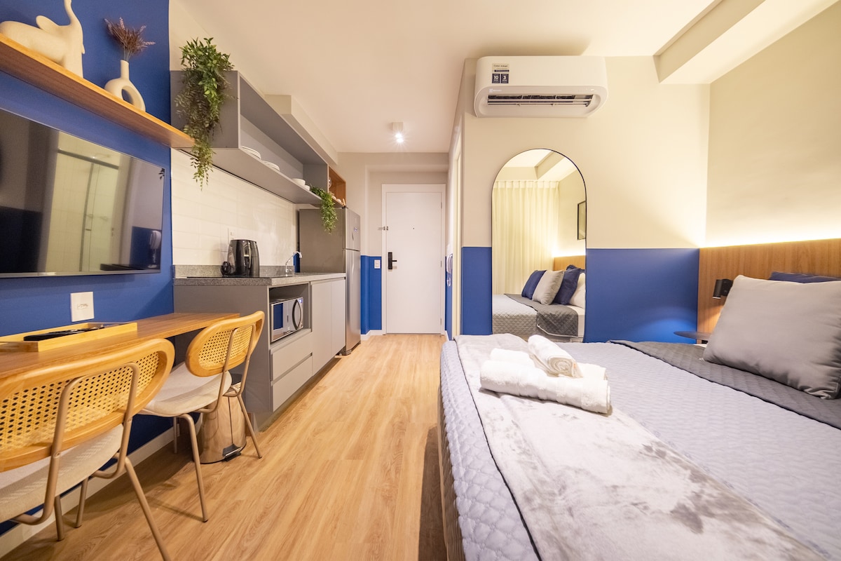 Studio completo e bem decorado no Brooklin! A 5 min do Metrô Brooklin, ao lado do Carrefour e próximo do consulado. Conta com cama confortável, ar-condicionado, Wi-Fi, Smart TV, cozinha equipada, banheiro moderno e enxoval incluso. Em rua tranquila, perto da Berrini, shoppings e comércios. Ideal para turismo, trabalho ou vistos