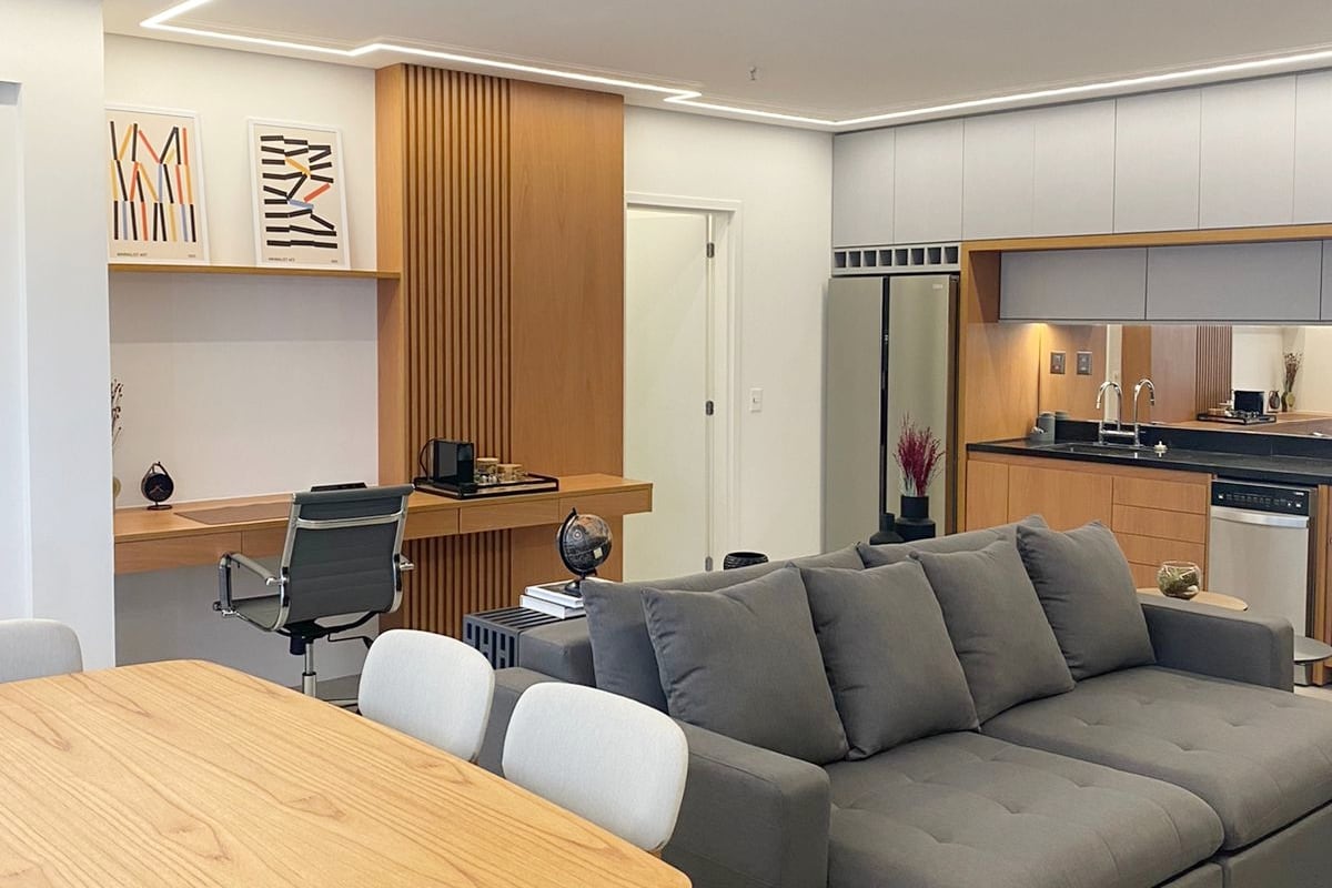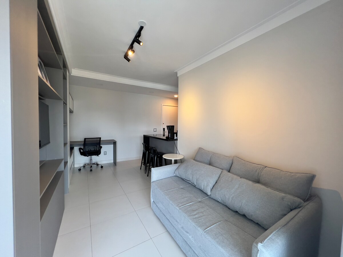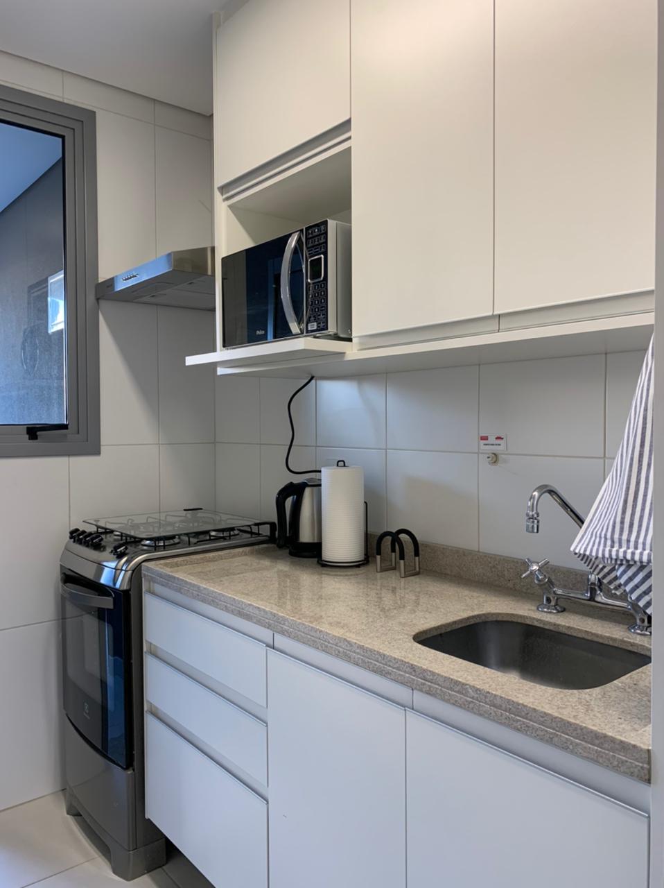High standard, built in January/2018, decorated and equipped for your comfort and well-being. It has a modern, clean decor, and the furniture and utensils are top of the line. The studio integrates living room/suite. Bathroom with built-in closet. Central gas heating. Full kitchen and service area with built-in closets. Balcony closed with roller blinds.