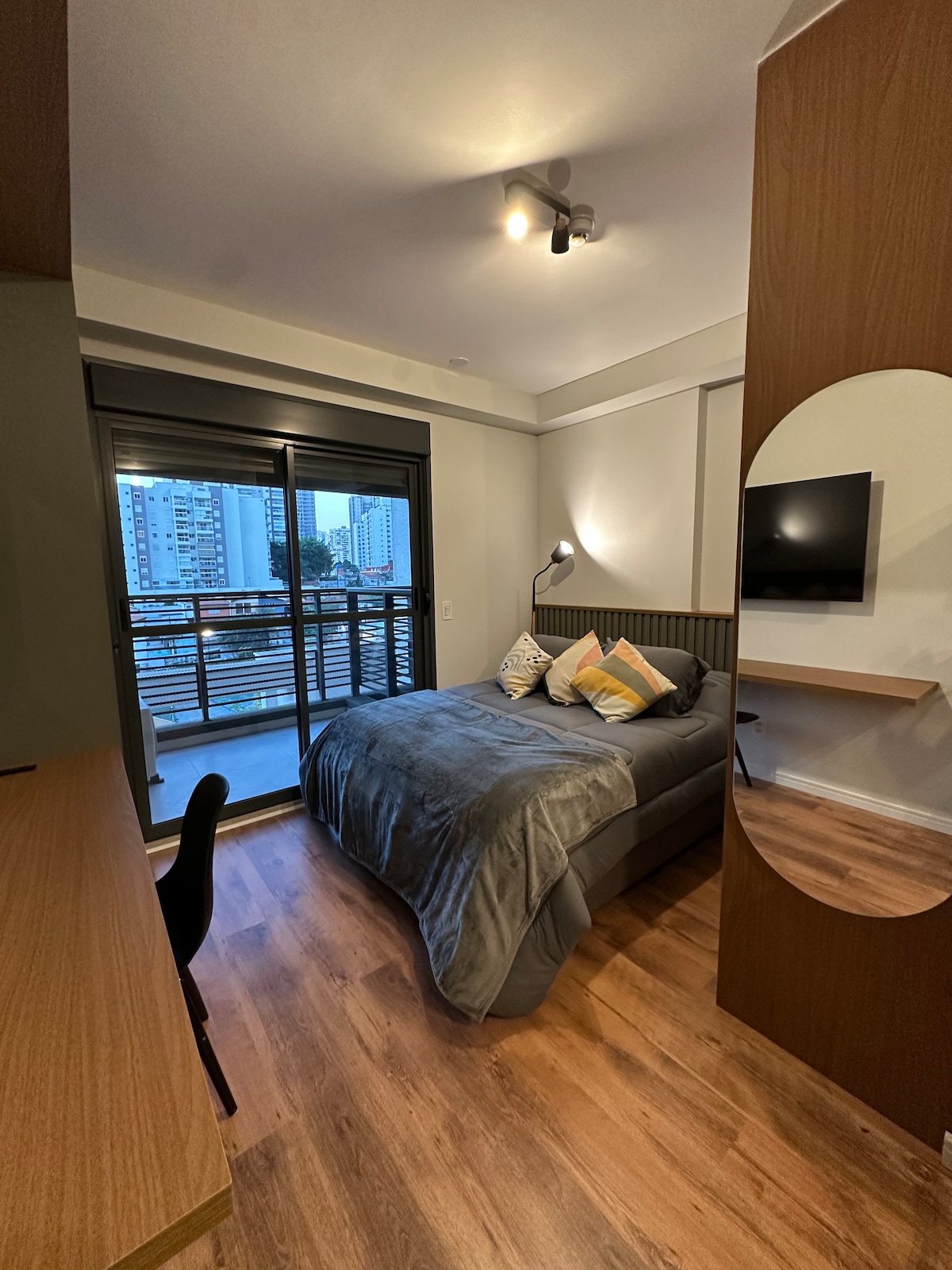 Studio completo e bem decorado no Brooklin! A 5 min do Metrô Brooklin, ao lado do Carrefour e próximo do consulado. Conta com cama confortável, ar-condicionado, Wi-Fi, Smart TV, cozinha equipada, banheiro moderno e enxoval incluso. Em rua tranquila, perto da Berrini, shoppings e comércios. Ideal para turismo, trabalho ou vistos