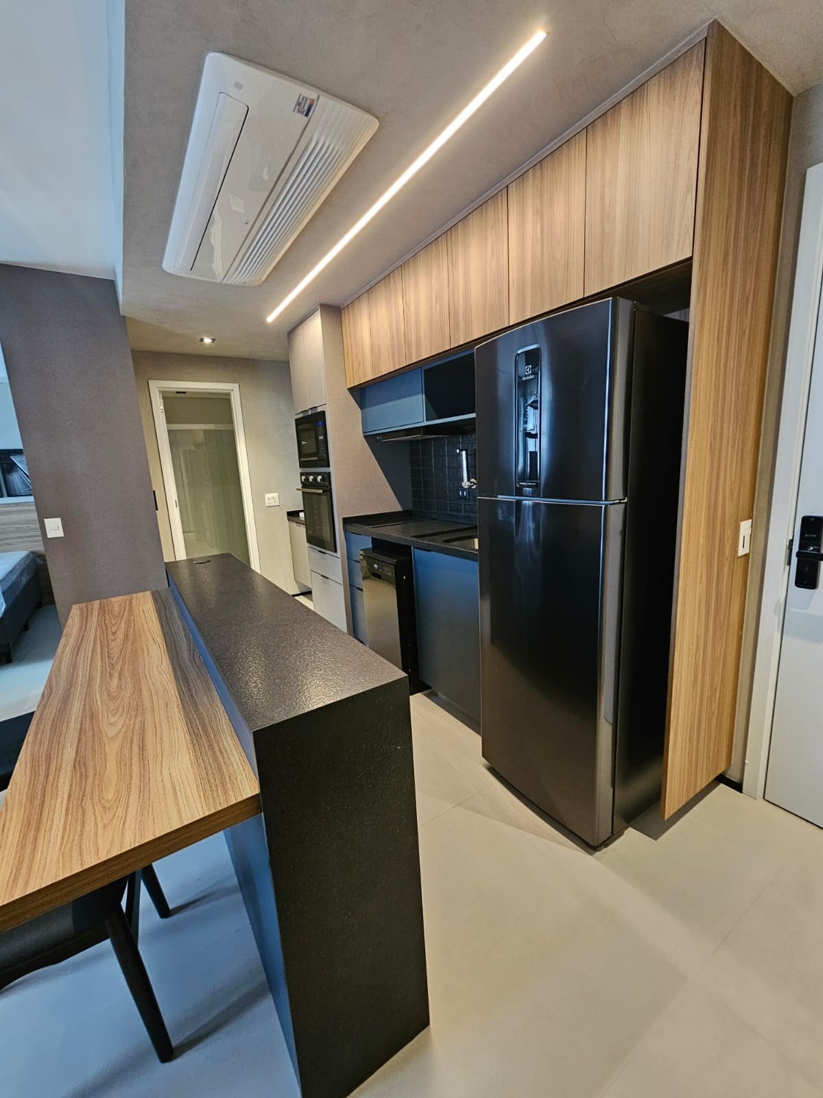 High standard, built in January/2018, decorated and equipped for your comfort and well-being. It has a modern, clean decor, and the furniture and utensils are top of the line. The studio integrates living room/suite. Bathroom with built-in closet. Central gas heating. Full kitchen and service area with built-in closets. Balcony closed with roller blinds.