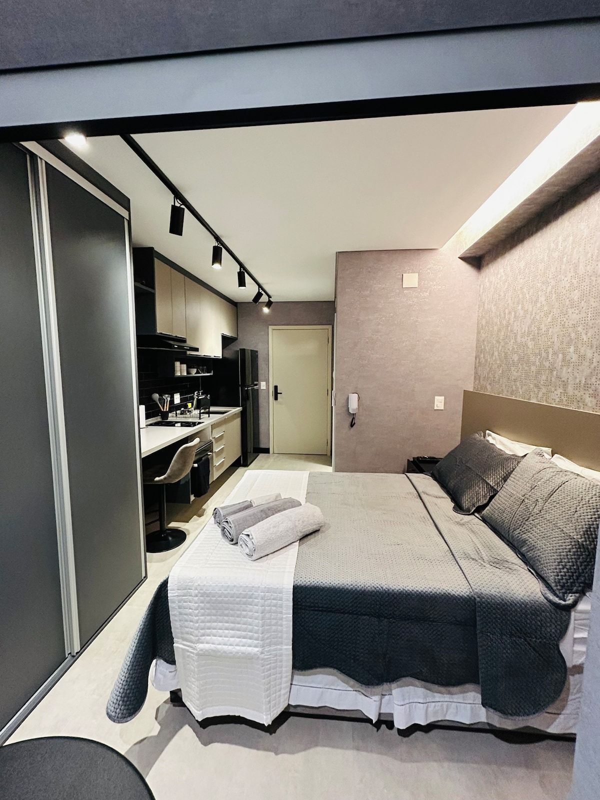 Loft novo, decorado com charme e elegância nas Perdizes. Quarto confortável e todo equipado com cama King Size, Geladeira, Fogão de Indução, Máquina de Lavar, Escritório com Internet Cabeada , TV 4K 55 Polegadas, Wi-Fi. 300m do Shopping Bourbon.