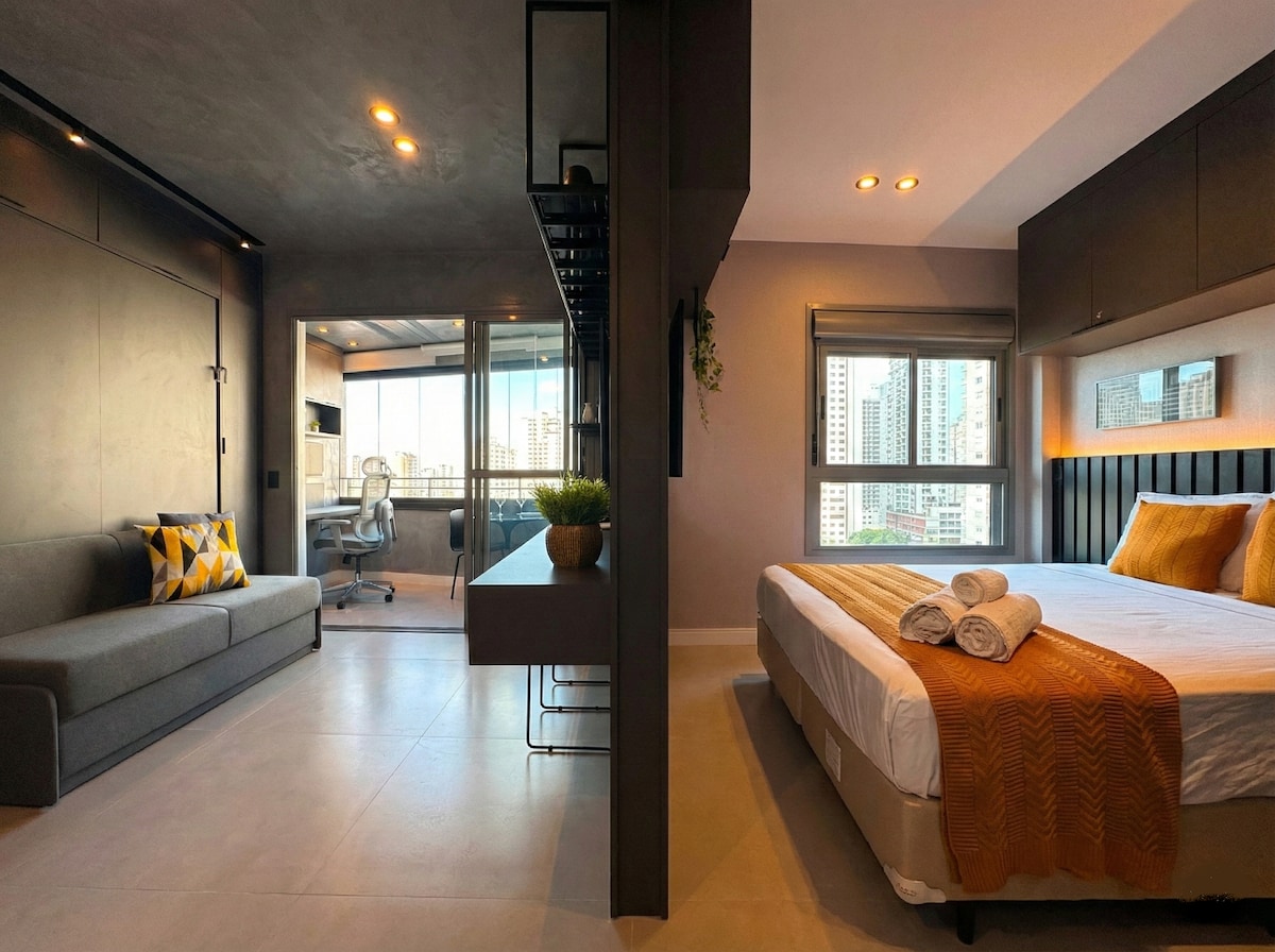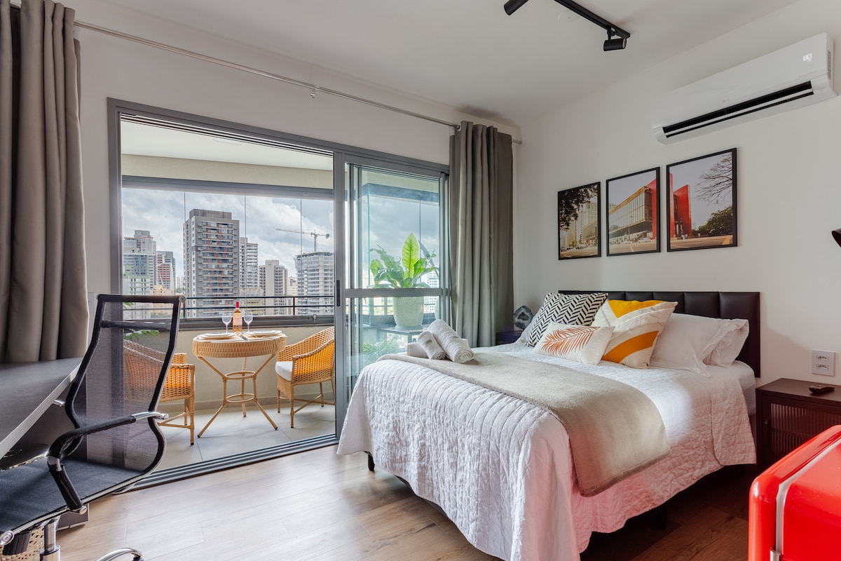 Enjoy a brand-new, modern, and beautifully decorated apartment with a stunning view. Instead of a cramped studio, you’ll have separate spaces that accommodate up to 4 guests. Conveniently located next to the Brooklin station and close to Moema, Pinheiros, Berrini, the U.S. Embassy, and Congonhas Airport, in a quiet and safe street. The building offers amenities like a gym, pool, sauna, and coworking space, as well as excellent restaurants, a supermarket, and a pharmacy right at your doorstep.