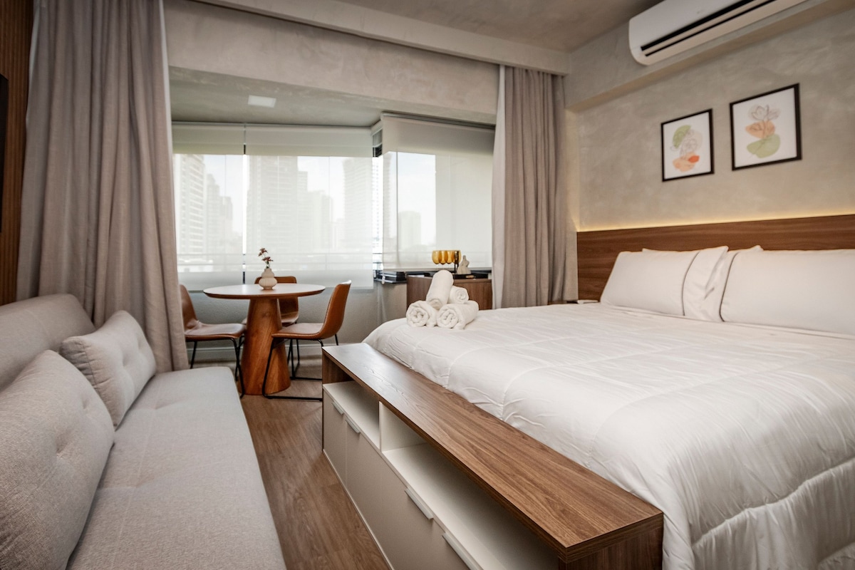 Experience One Eleven in Vila Olimpia. This modern apartment features large windows with breathtaking city views and natural light. The unit boasts 600 Mbps internet and a 4K HD TV. For total comfort, it has a Hot/Cold AC system: 27,000 BTU/h unit in the living room and 10,000 BTU/h in the bedroom. The bedroom is quiet and dark for a restful sleep. Impeccably maintained, you’ll be walking distance to top restaurants and business hubs—a safe, upscale retreat with a stunning urban backdrop.
