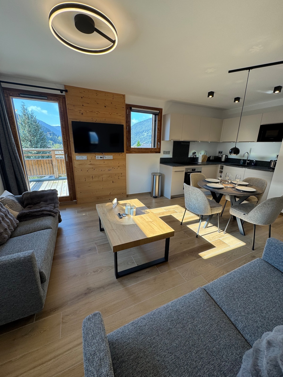 Appartement NEUF 3 chambres Proche pistes (Avoriaz, Pleney) en quelques arrêts de navette gratuite (piétons et vélos): l’arrêt sur notre parking! Parking intérieur fermé pour motos (idéal HARLEY DAYS) et vélos sur demande Parking extérieur Belle vue, grand jardin Buanderie Skiroom Idéalement situé : - 5 min à pied de l’Eglise - 10 à 15 minutes à pied du centre, piscine, tennis, parc des dérêches - Arrêt de la navette gratuite sur notre parking