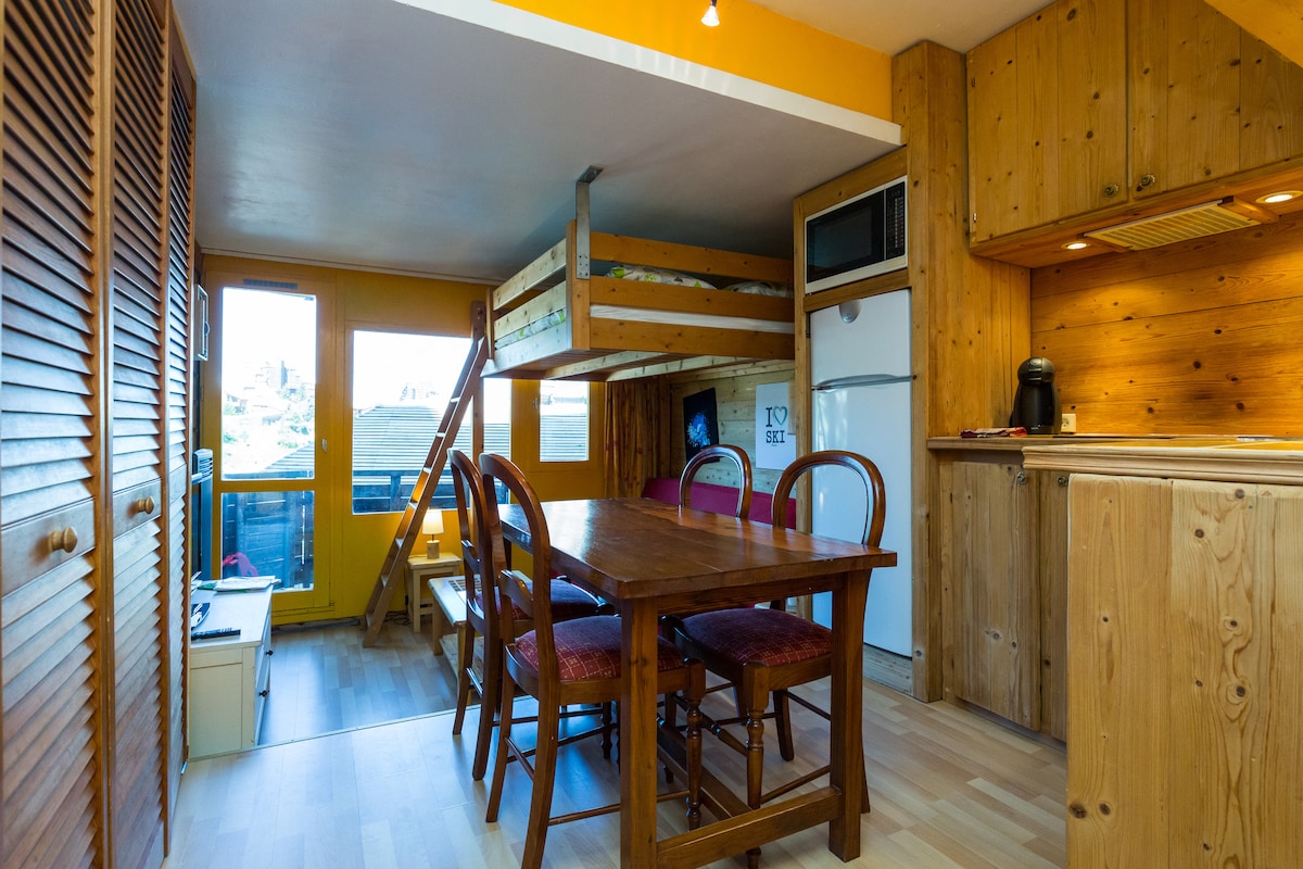 Located right in the center of the village and directly on the ski slopes. Suitable for 4 persons (1 clic clac bed & 1 mezzanine double bed). Fitted kitchen (induction, multifonction oven, fridge, filter coffee machine and Nespresso ). TV and fiber wifi. Balcony. Newly renovated bathroom in 2023.