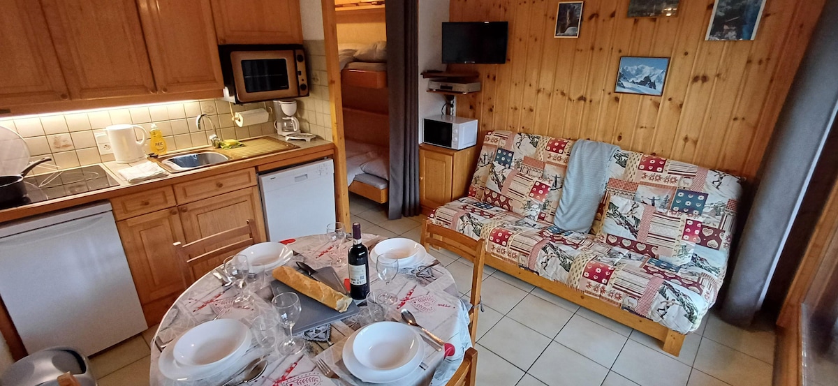 4 couchages (chambre séparée) aux pieds des pistes (face télésiège stade/arare), avec balcon. Draps et serviettes fournis 5 min à pieds du téléphérique des Prodains 10 min à pieds du centre du village (100m de dénivelé) Casier à Ski Equipements: -Cuisine salon salle à manger équipée (micro-onde, lave vaisselle, TV) - 1 canapé lit - Chambre séparée (lit 140 cm) - WC séparé - Salle de bain séparée Les PLUS: Draps et Serviettes fournis Le calme, la vue Jeux de société enfants et adultes