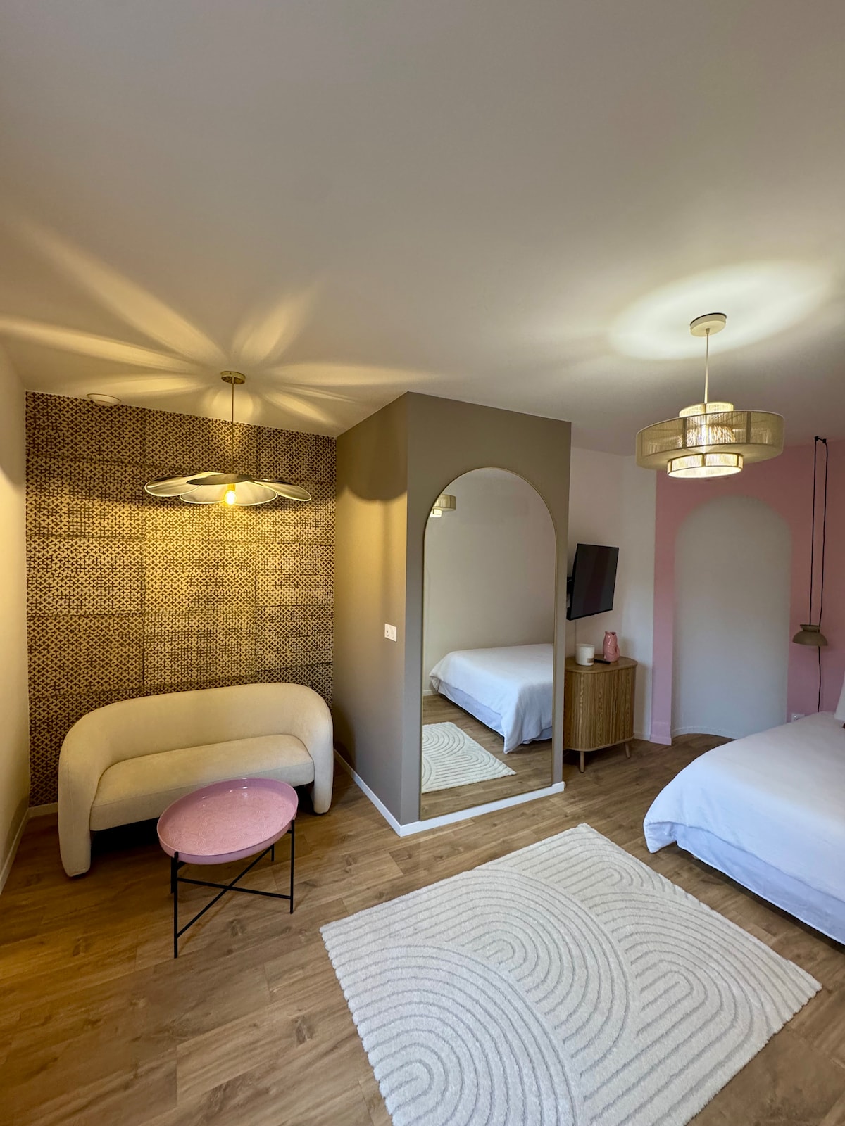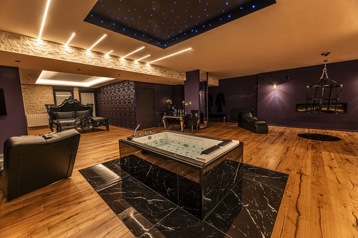 Bienvenue dans l'univers envoûtant de notre Love Room. À travers les différentes textures luxueuses et les lumières tamisées qui dansent avec sensualité, vous découvrirez un espace où le désir prend vie. Chaque meuble, chaque élément de décoration, témoignent de la créativité d’une seule personne, de son art à sculpter le décor pour vous plonger dans un monde où l’amour devient une œuvre d’art et où chaque nuit devient un chapitre inoubliable de votre histoire intime.