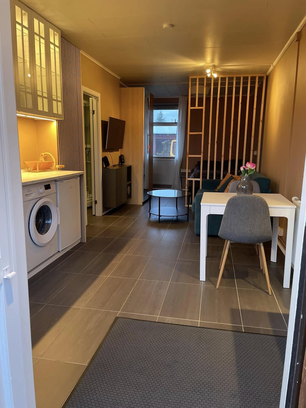 A modern newly built one bedroom apartment 5 minutes walking distance from Sky Lagoon with a parking spot in a garage. Fully equipped kitchen, new AI washer and dryer from Samsung. Smart tv with all streaming services downloaded. Queen sized bed(160x200cm), also possible to use the sofa as a bed by removing the cushions and a extra pillow and duvet are on site. Cozy and safe neighbourhood with a bakery and restaurant in walking distance and a grocery store only 4 minutes away by car.