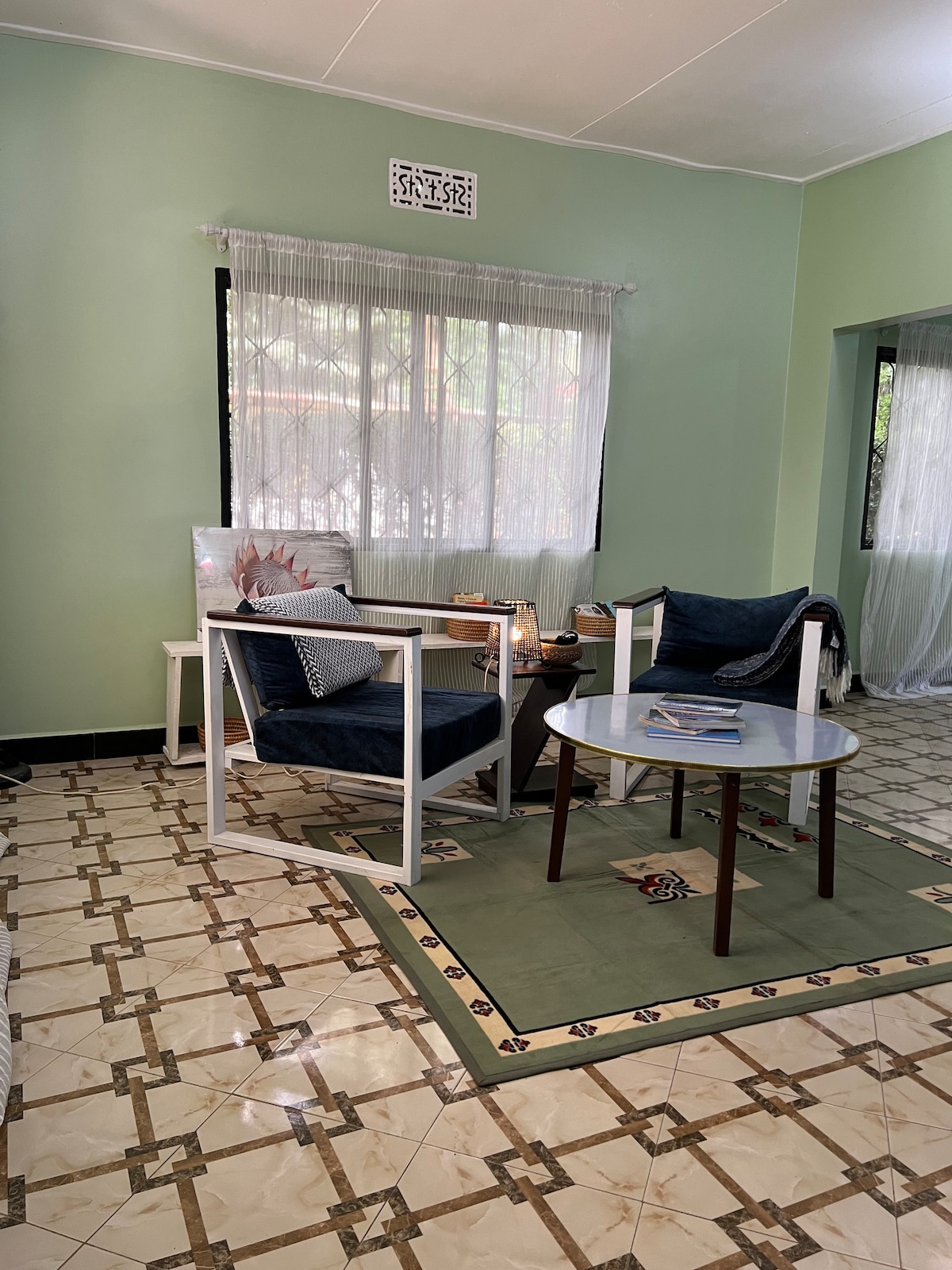 A peace full home in a quiet neighborhood. Secure fenced compound with security guard, free parking in the compound. Covered porch to enjoy the gardens and nice climate. Ground floor: two self contained bedrooms, living room, kitchen with cooking facilities and fridge, store and public bathroom. On first floor two additional rooms and big open space. Easy access to public transport. Nice view on mount Kilimanjaro.